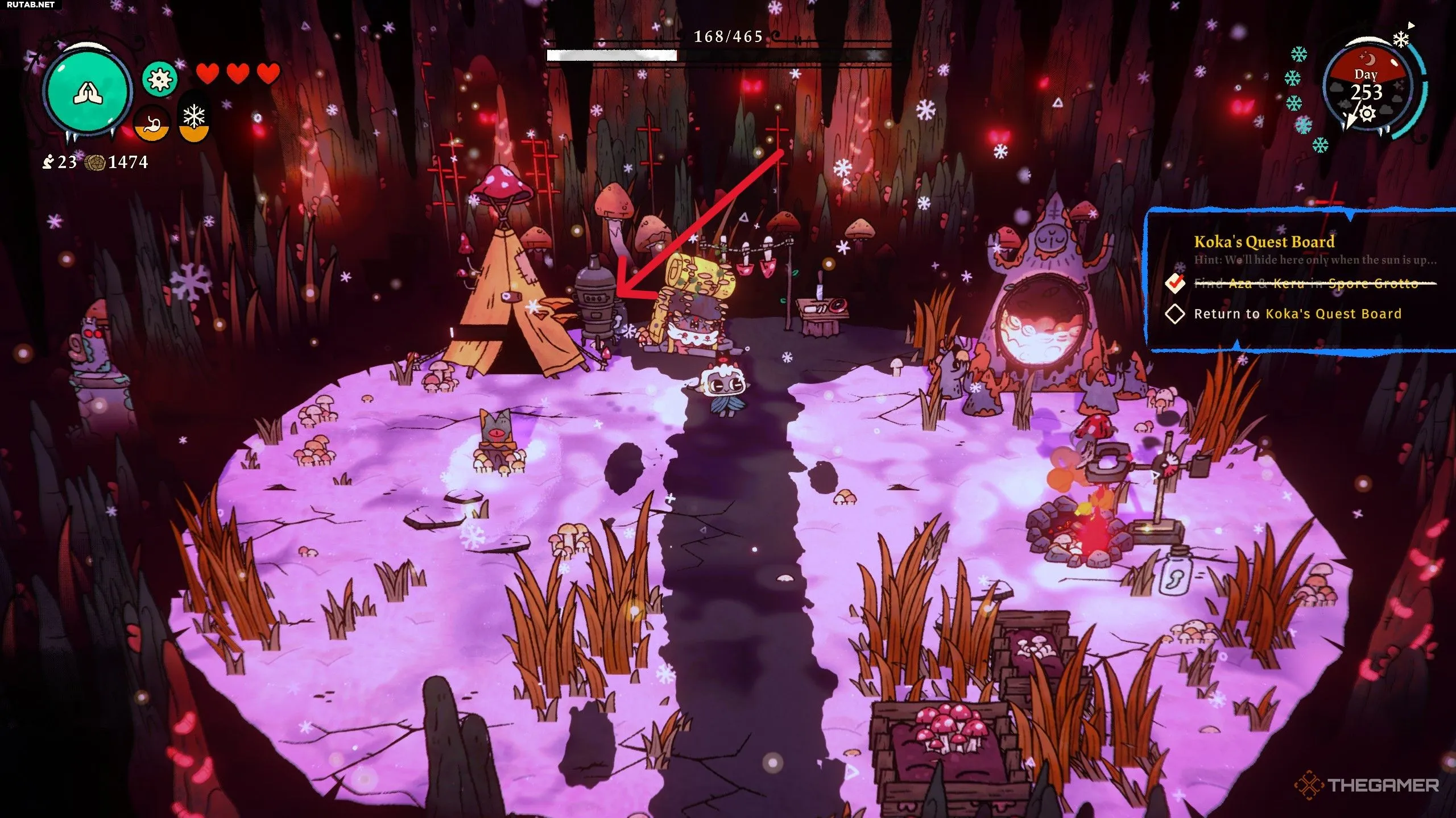 Как только вы возьмёте следующий квест в прятки с доски, вам нужно будет отправиться в Споровый Грот днём. По прибытии идите прямо в заднюю комнату и взаимодействуйте с маленькой печкой в левом верхнем углу. Это снова заставит Азу и Керу появиться, после чего они убегут прятаться в другое место.