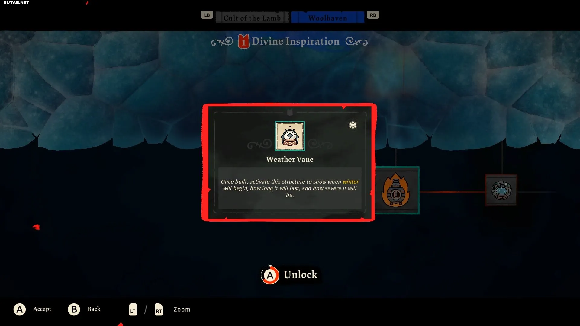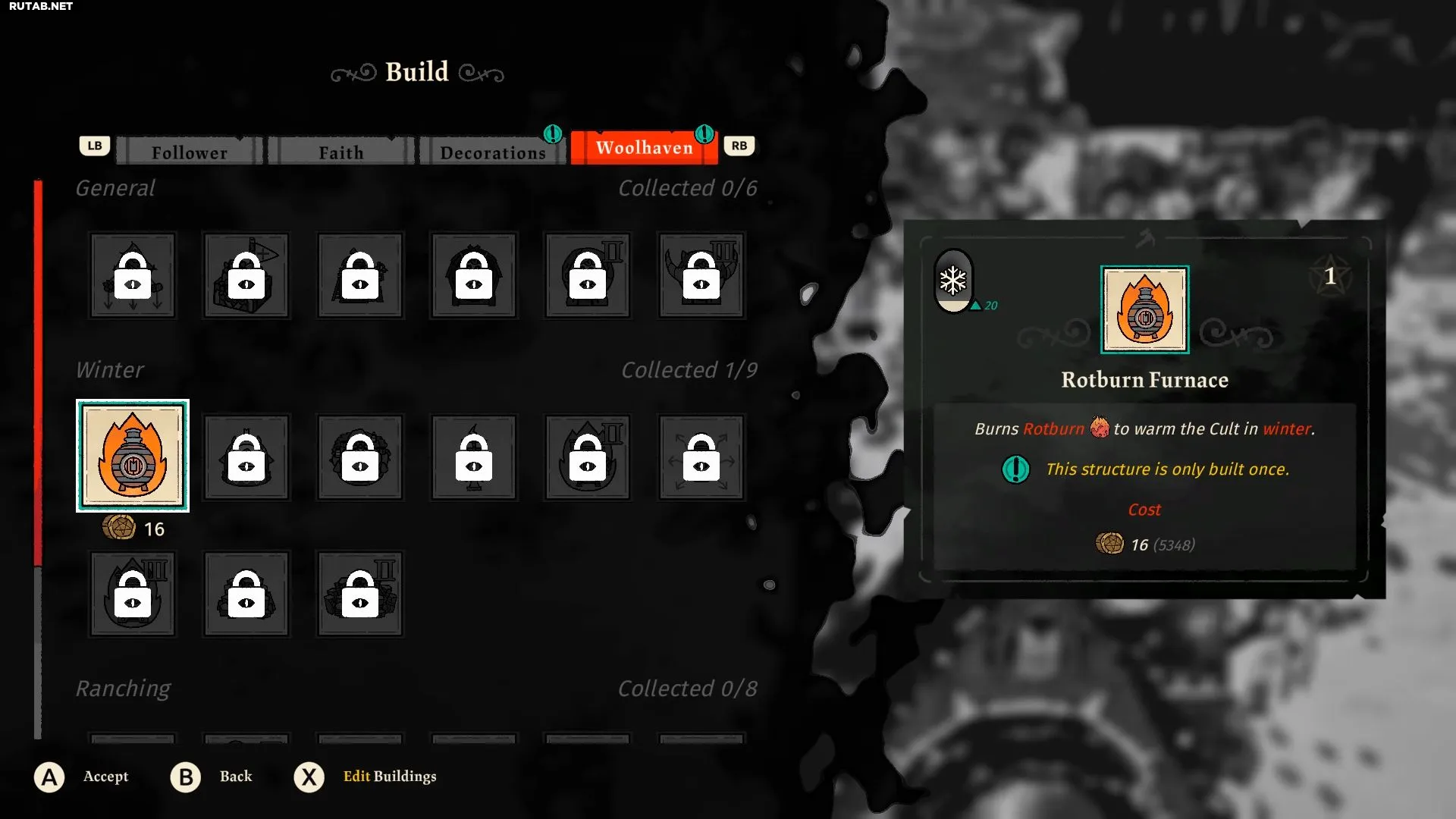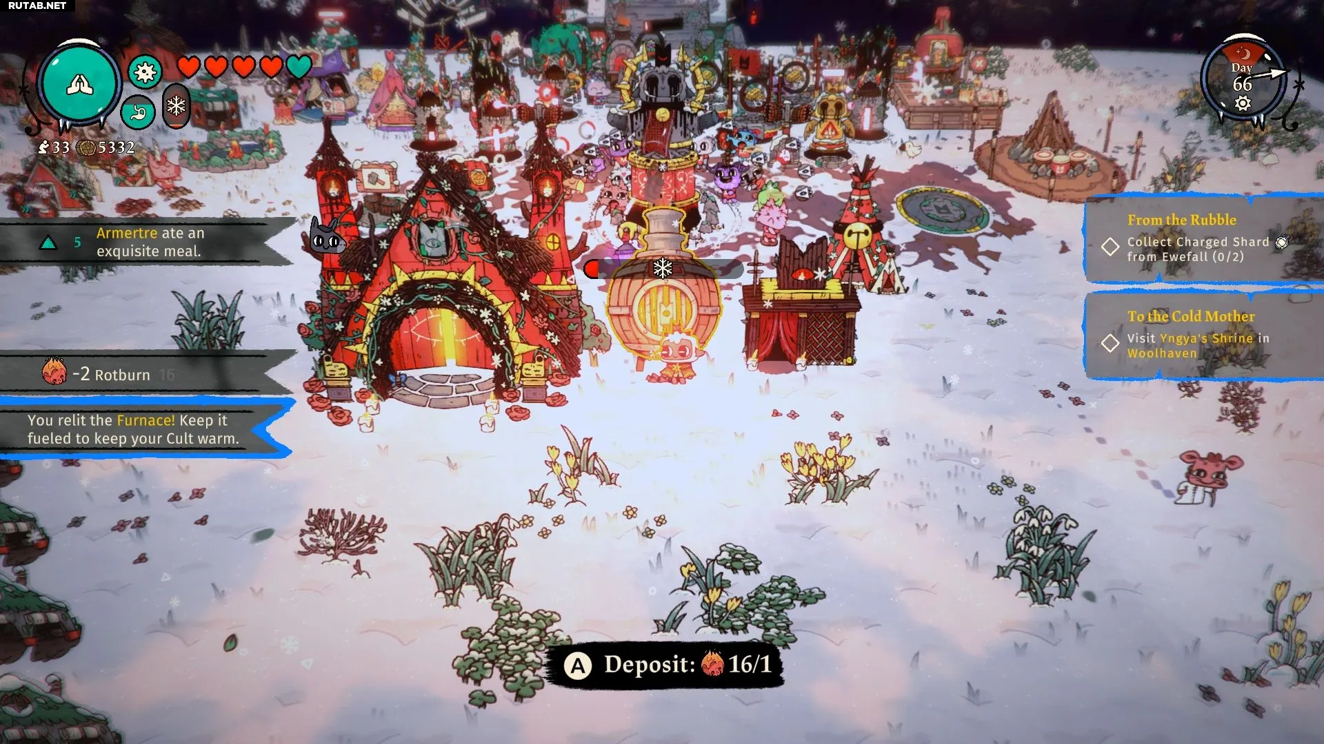 Зима начнётся после открытия локации Woolhaven, и вы сразу заметите, как последователям становится холодно. Чтобы согреть стадо, вам нужно построить Печь для Гнилотоплива (Rotburn Furnace).