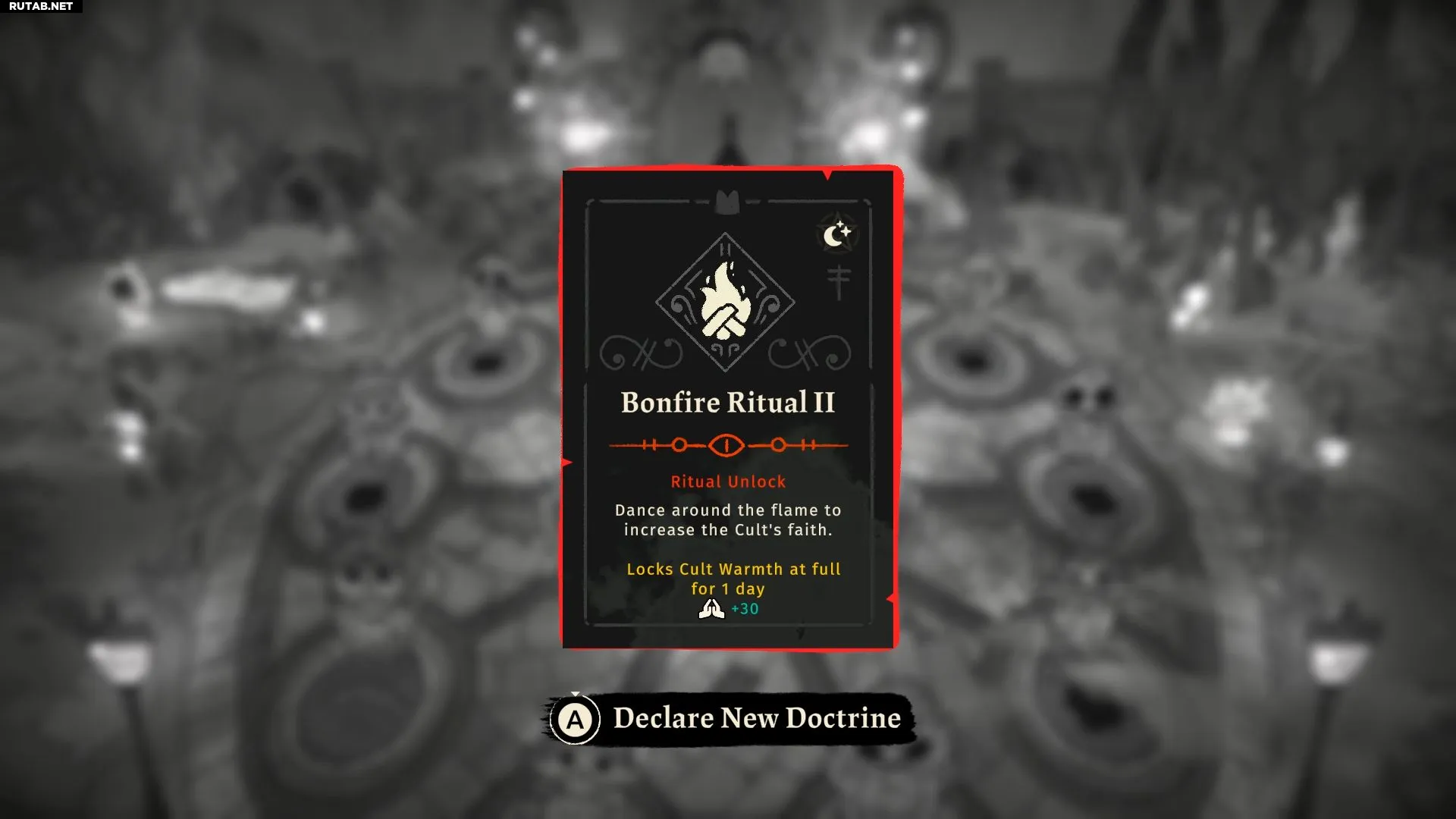 Позже Йингия улучшит ритуал «Костёр», добавив ему дополнительный эффект: тепло в культе будет оставаться на максимуме в течение одного дня. Это отличное подспорье, если вам срочно нужно собрать Гнилотопливо или вы не можете уделять стадо достаточно внимания.