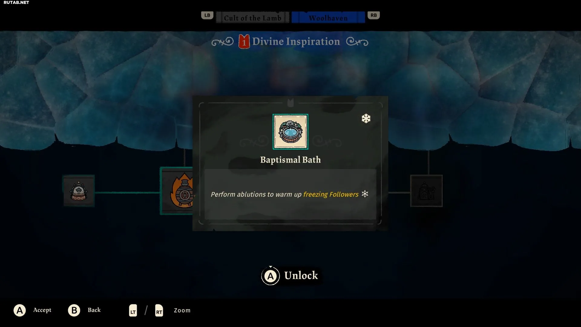 Если вы забудете пополнить печь и ваши последователи начнут замерзать, вы можете построить Купель для крещения (Baptismal Bath), чтобы их отогреть. Эта постройка всё равно потребляет Заряженный осколок, так что злоупотреблять ей не получится. Позже появятся и другие способы остановить замерзание, но для этого нужно продолжать основной квест Йингии в дополнении Woolhaven.