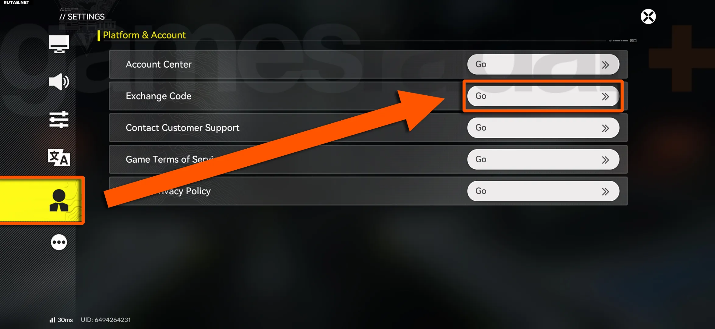 Чтобы ввести промокод, вам нужно завершить пролог «Процесс: Холодный старт» и получить контроль над персонажем на «Дицзян». После этого можно открыть меню паузы или, позже, нажать на иконку шестерёнки в левом верхнем углу главного экрана. В настройках перейдите во вкладку «Платформа и аккаунт» и нажмите кнопку «Перейти» рядом с опцией «Код для обмена». Откроется окно для ввода промокода.