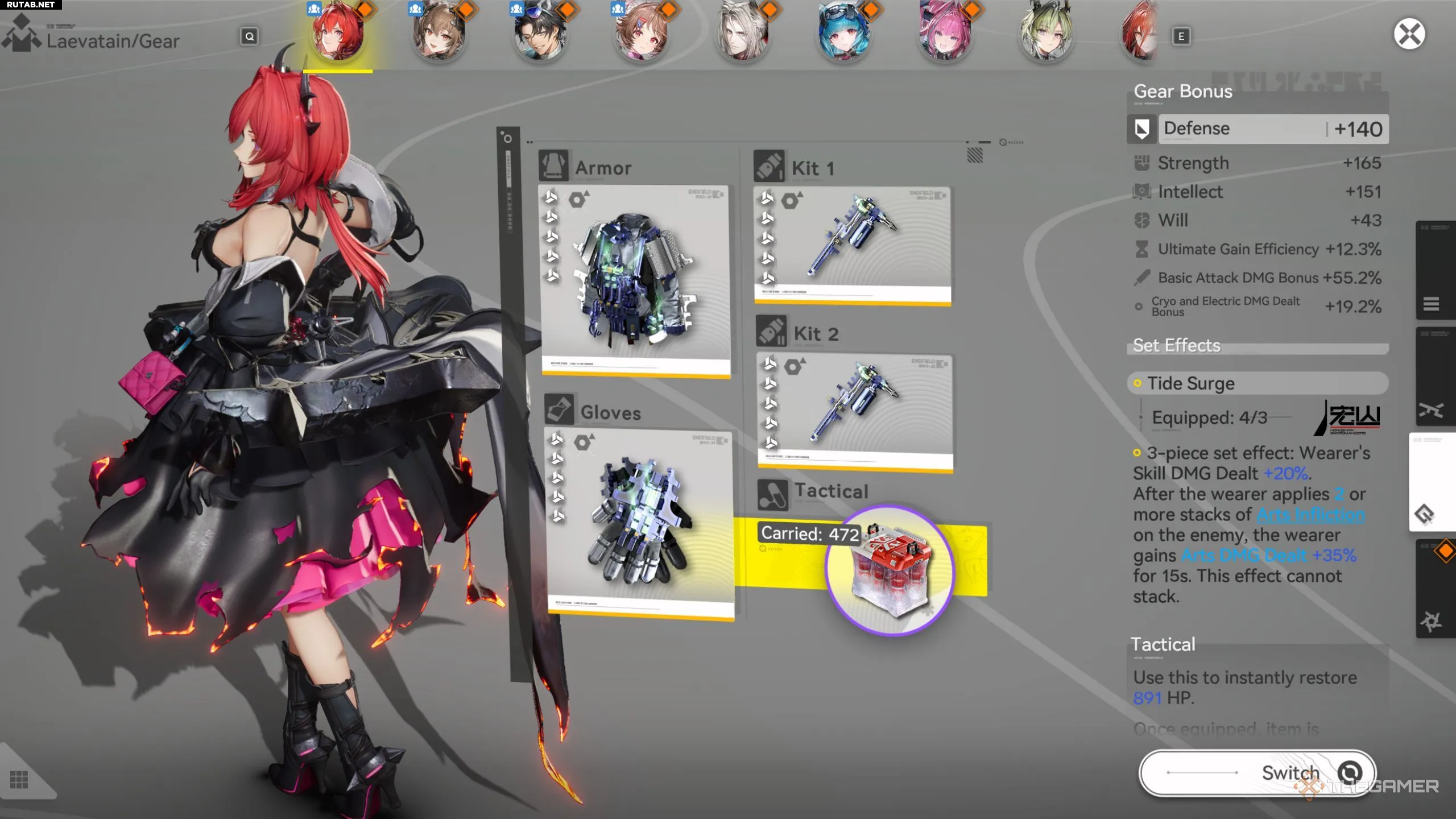 Для Лаэватейн в приоритете базовые характеристики Интеллект и Сила искусств, а вторичным усилением — урон от базовых атак. Резак из набора «Натиск прилива» идеально подходит под эти требования и отлично сочетается с её основным комплектом «Горячая работа».