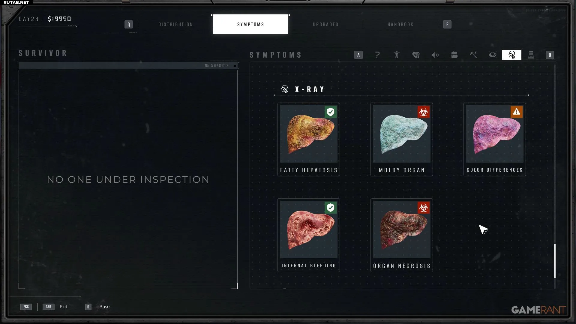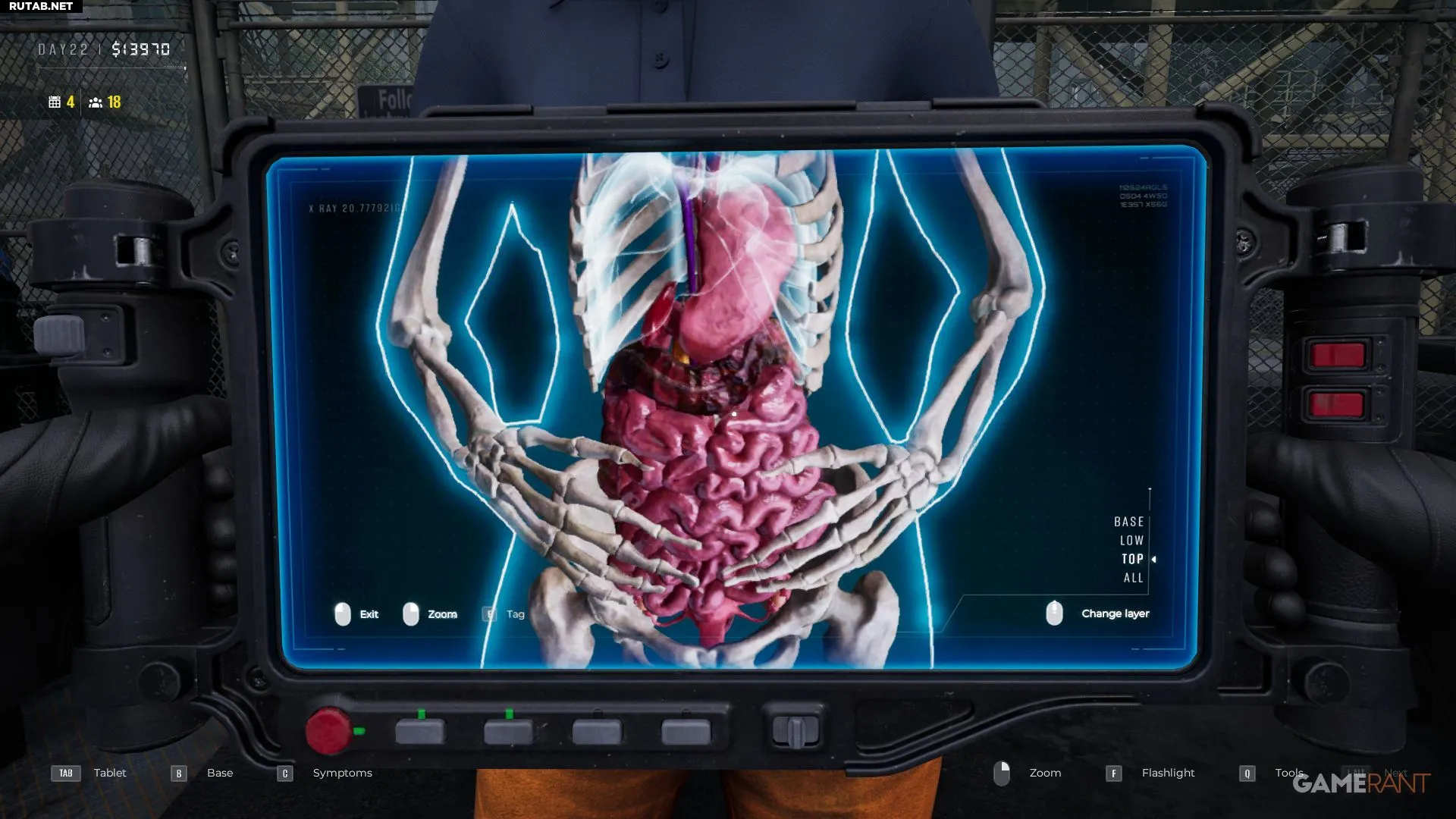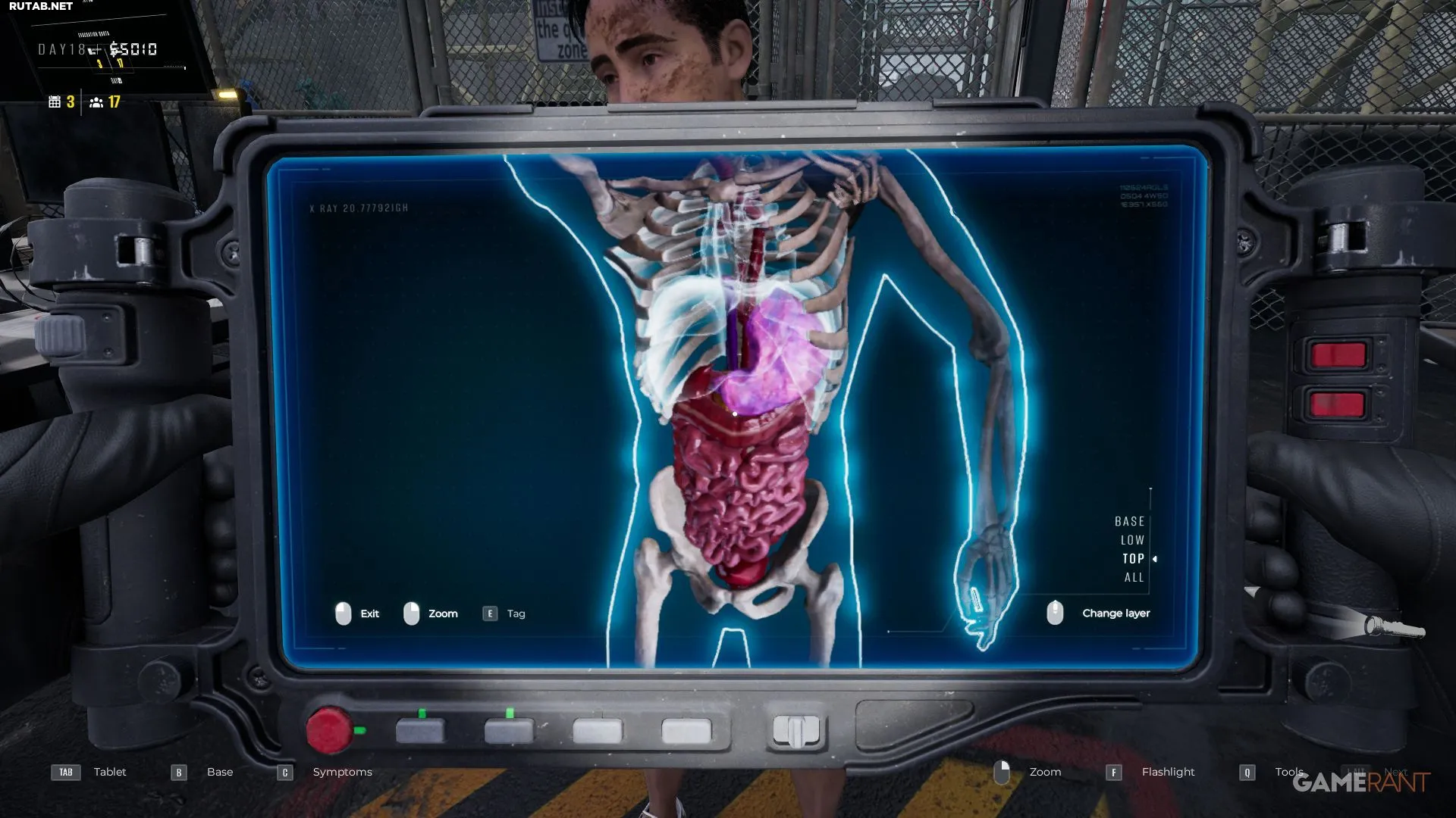 После разблокировки рентгена в Quarantine Zone изначально известен только симптом Внутреннее кровотечение. Однако в лаборатории можно открыть ещё четыре, что в сумме даёт пять симптомов внутренних органов. Их бывает сложно заметить, так как они выглядят по-разному для каждого органа.