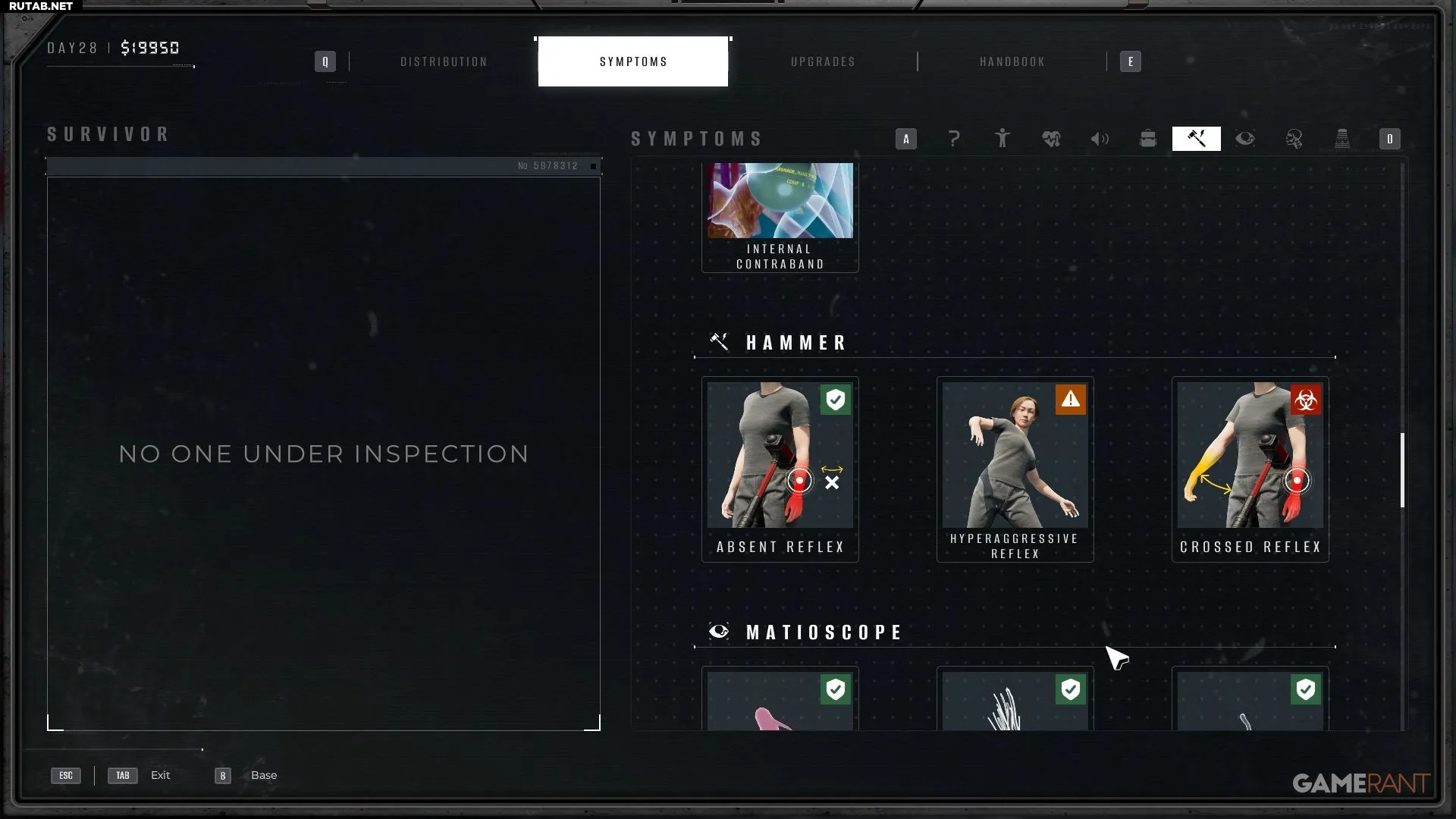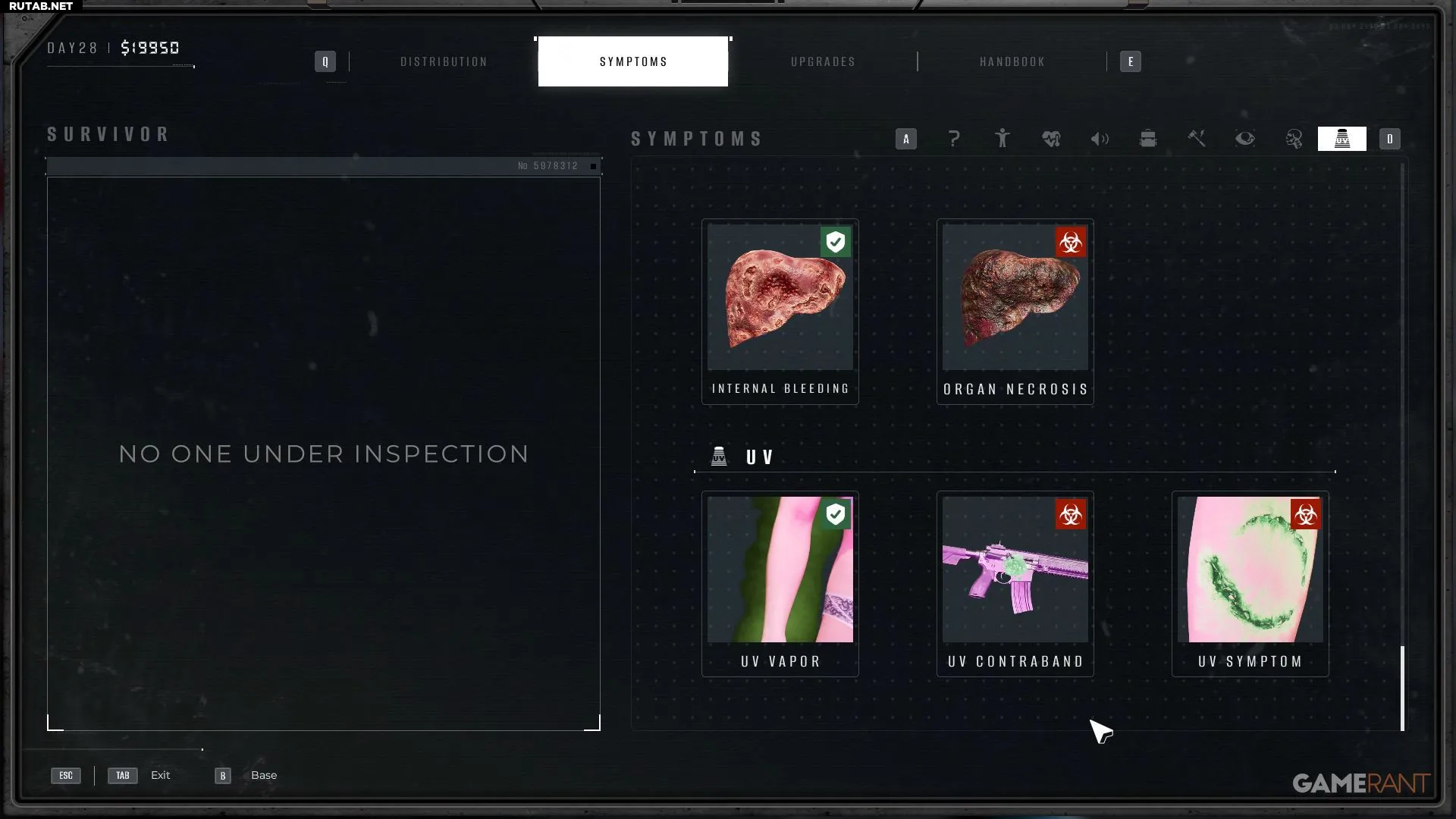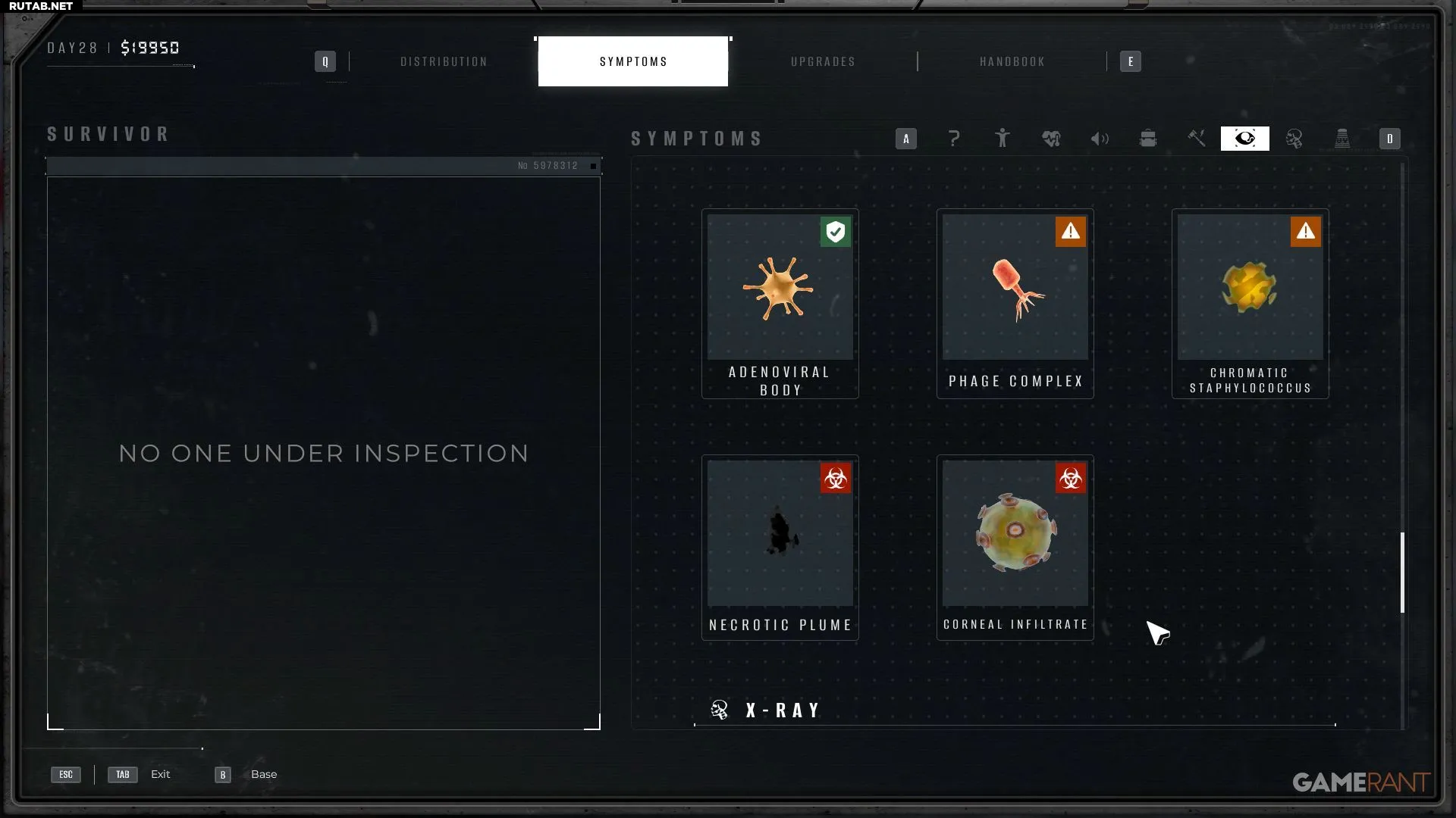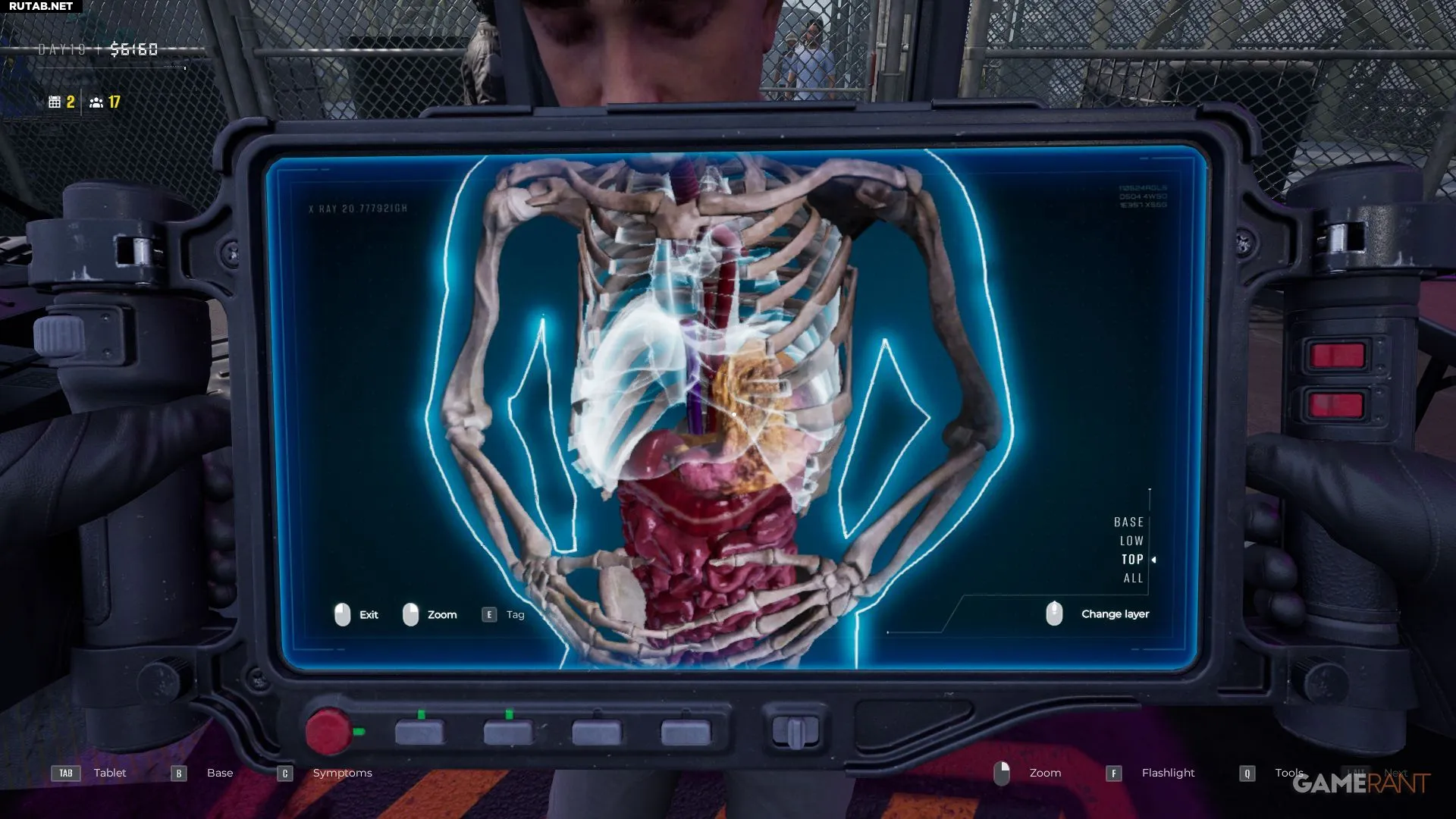 После разблокировки рентгена в Quarantine Zone изначально известен только симптом Внутреннее кровотечение. Однако в лаборатории можно открыть ещё четыре, что в сумме даёт пять симптомов внутренних органов. Их бывает сложно заметить, так как они выглядят по-разному для каждого органа.