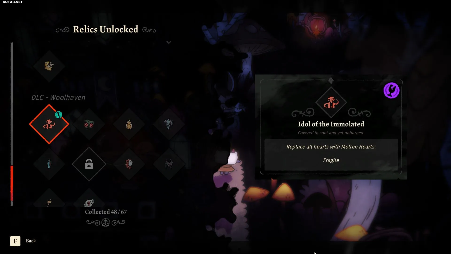 Первый Гнилой глаз свидетеля разблокирует реликвию «Идол испепелённого». Она помечена как хрупкая, а значит, её можно использовать только один раз. При активации она заменяет все сердца Овна на Раскалённые сердца, которые поджигают врага при ударе по ягнёнку.