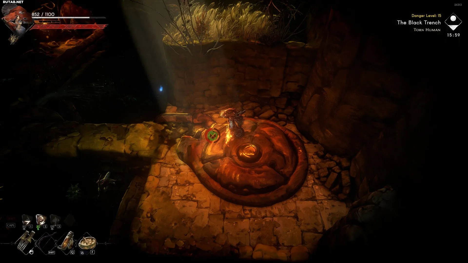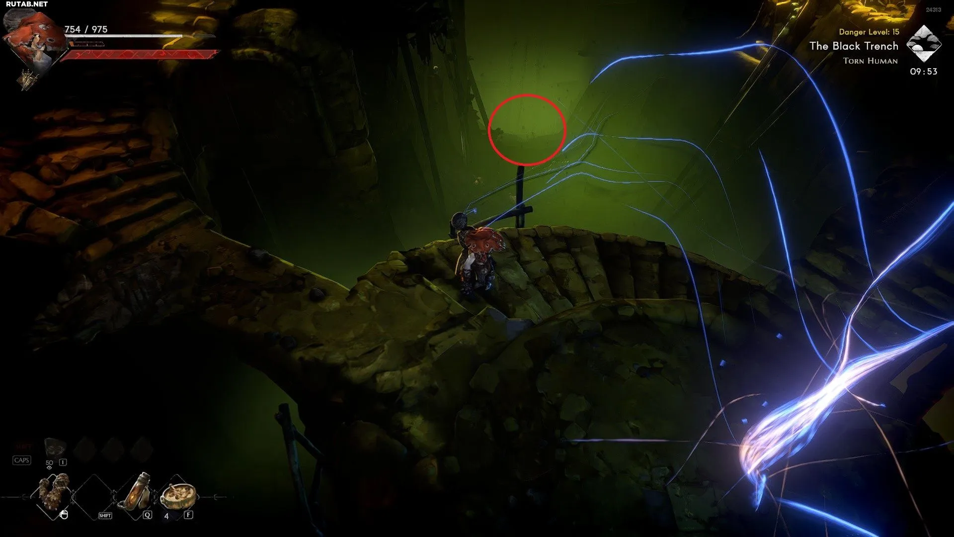 Чтобы начать исследование Чёрной траншеи, активируйте Шёпот, следуя по пути налево. Затем спуститесь по лестнице вниз и направляйтесь к точке, отмеченной на изображении выше. Там вы найдёте Ключ от дренажных подвалов, который открывает дверь, ведущую в остальную часть подземелья. Вернитесь назад и прижмитесь к левой стене. Используйте найденный ключ, чтобы открыть там дверь.