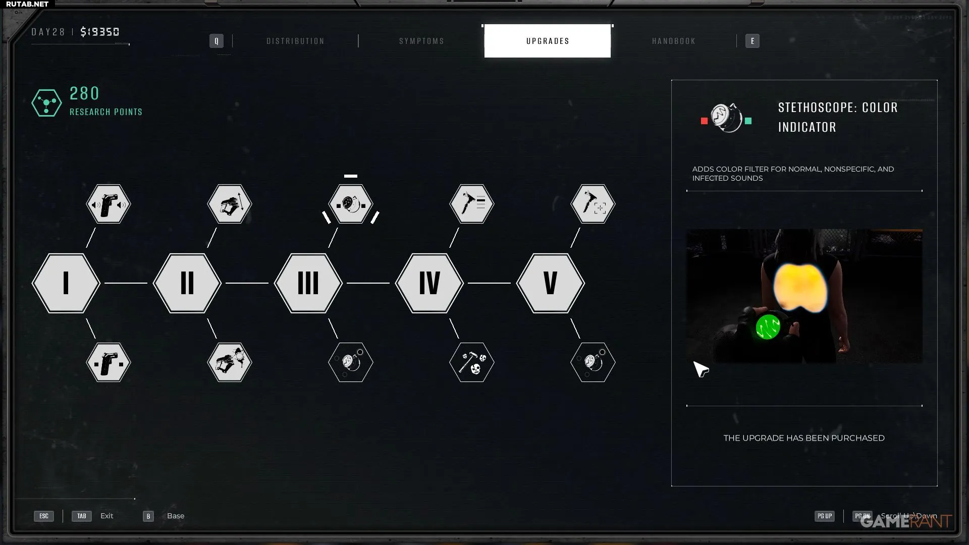 Из этих улучшений самым приоритетным является «Цветовой индикатор», так как звук перестаёт играть решающую роль. После его открытия для проверки достаточно просто навести стетоскоп на чёрное пятно и посмотреть на его цвет.