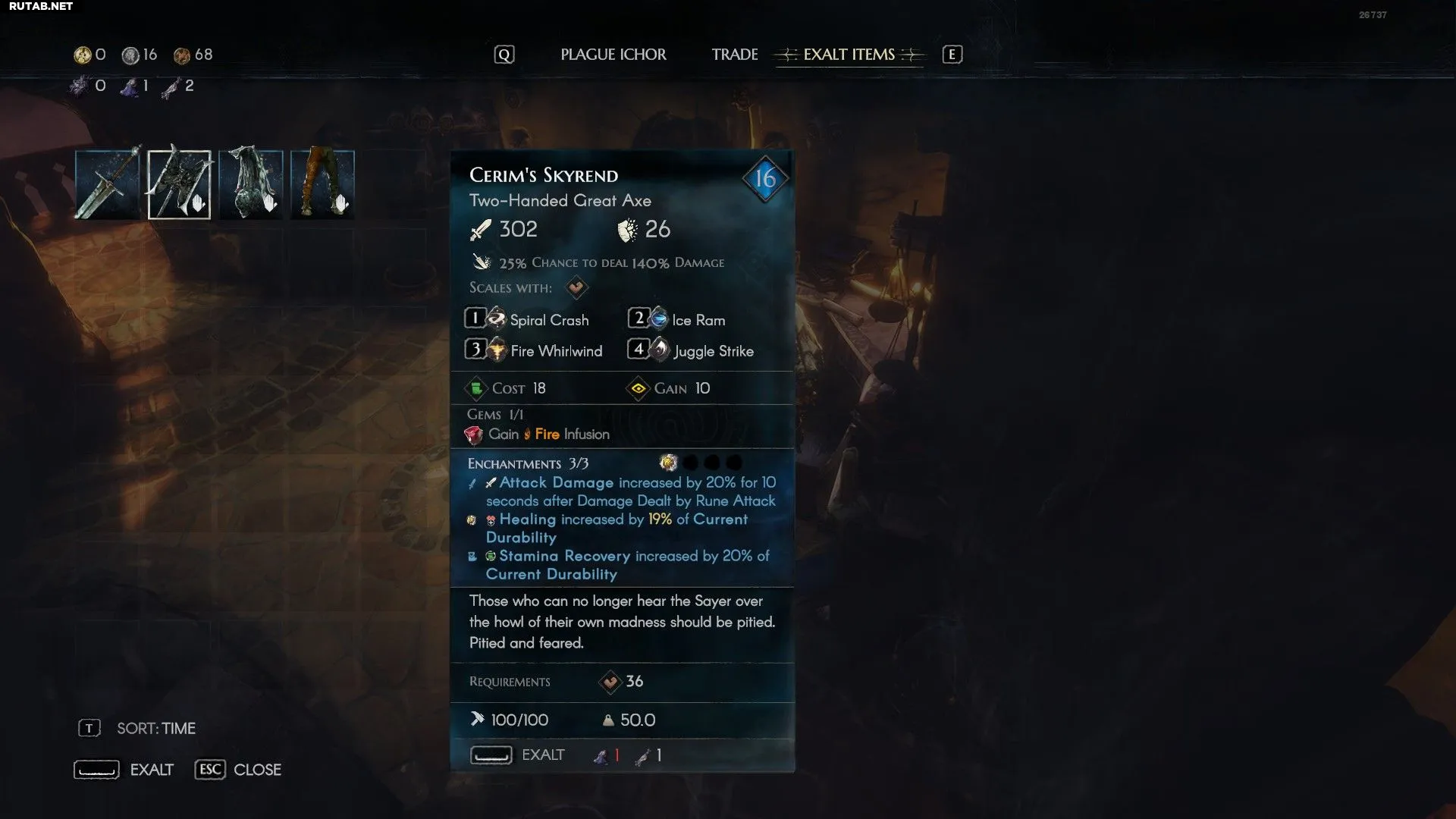 Процесс Возвышения увеличивает силу одного из установленных камней или чар на 50%. Игра случайным образом выбирает, какой атрибут будет усилен при каждом Возвышении, причём один и тот же атрибут можно усилить несколько раз.