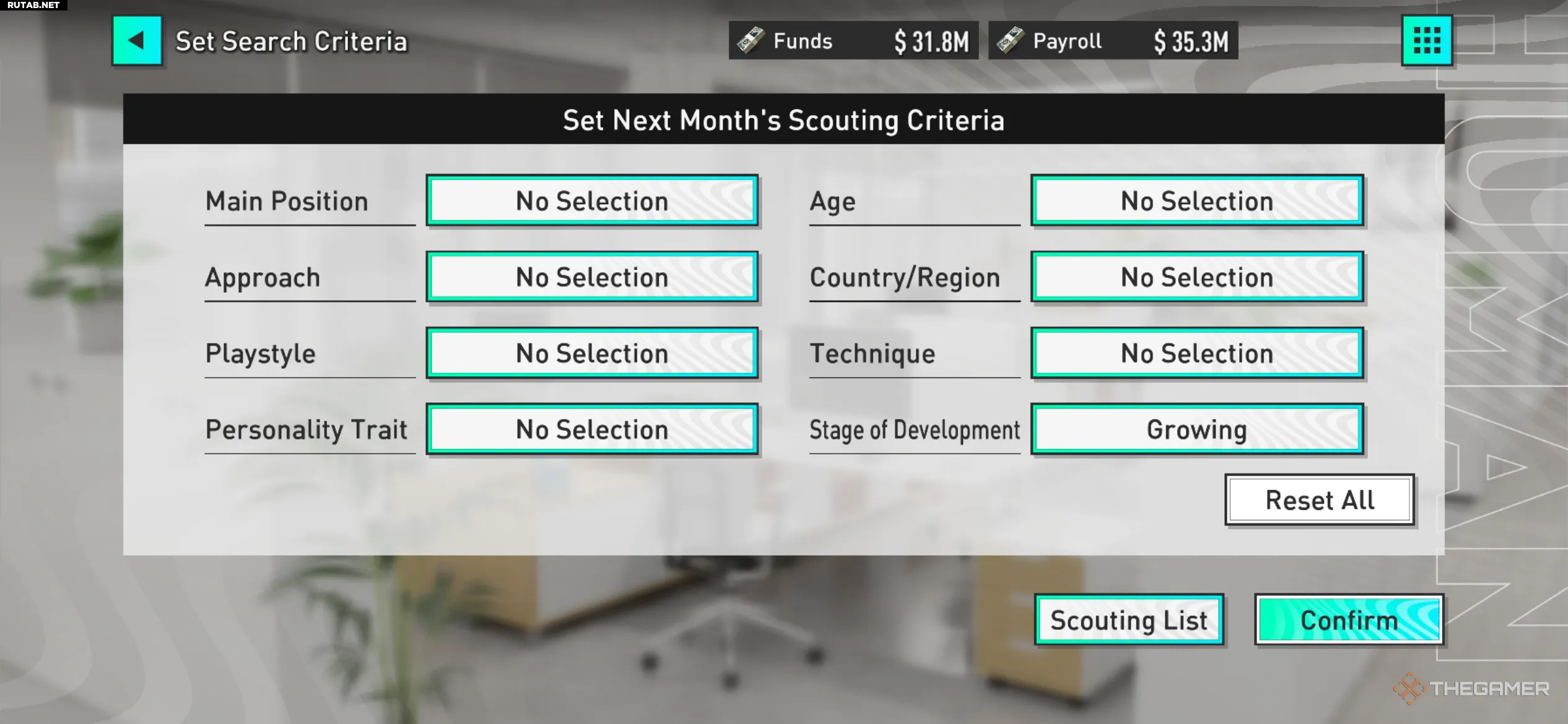 Первый шаг в поиске лучших талантов — сузить критерии скаутинга с помощью восьми выпадающих меню: