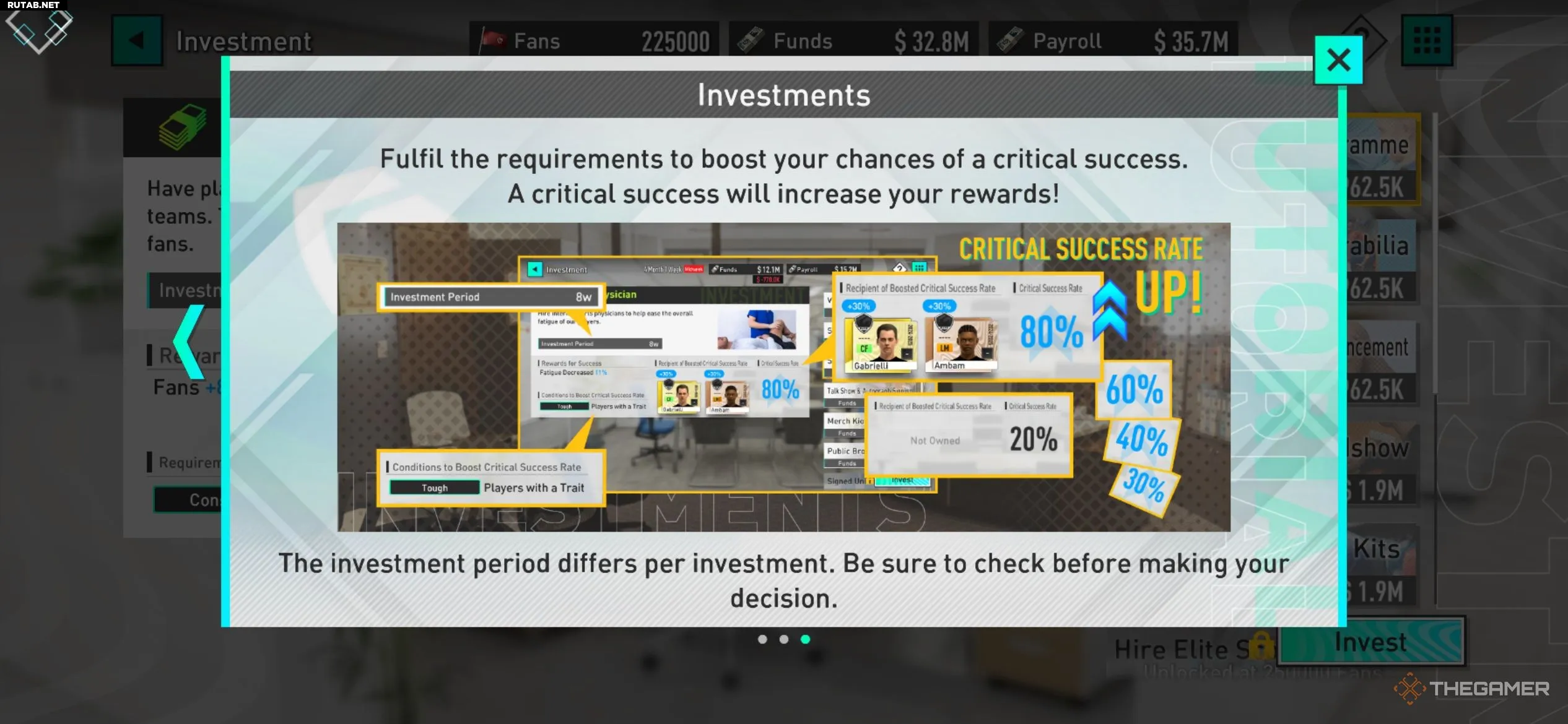 В двух из первых трёх инвестиций вам следует выбрать те, что увеличивают количество фанатов. Это приведёт к нарастающему положительному эффекту по мере ваших побед и роста общего бюджета.
