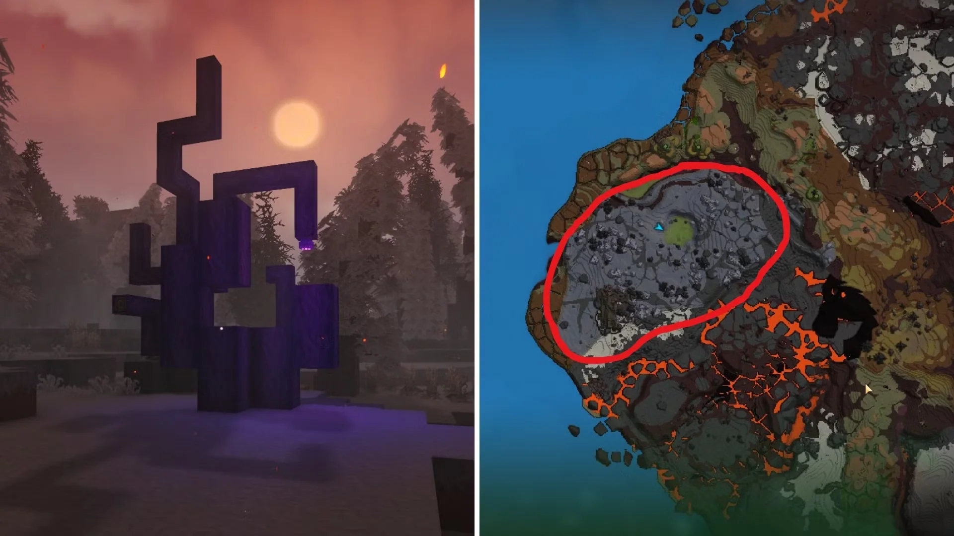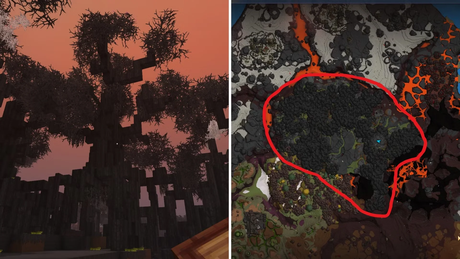 Небольшие, деформированные деревья без листьев, но с светящимся фиолетовым ядовитым плодом, прикреплённым к одной из ветвей.