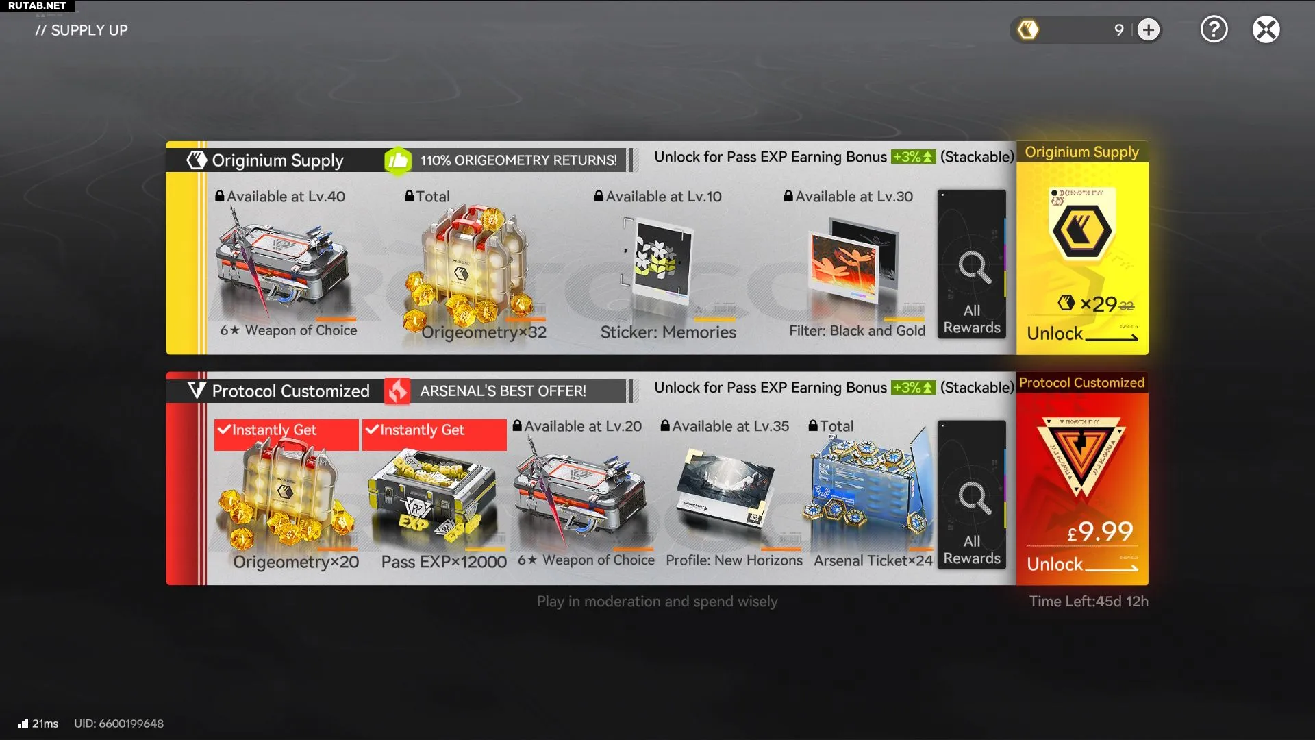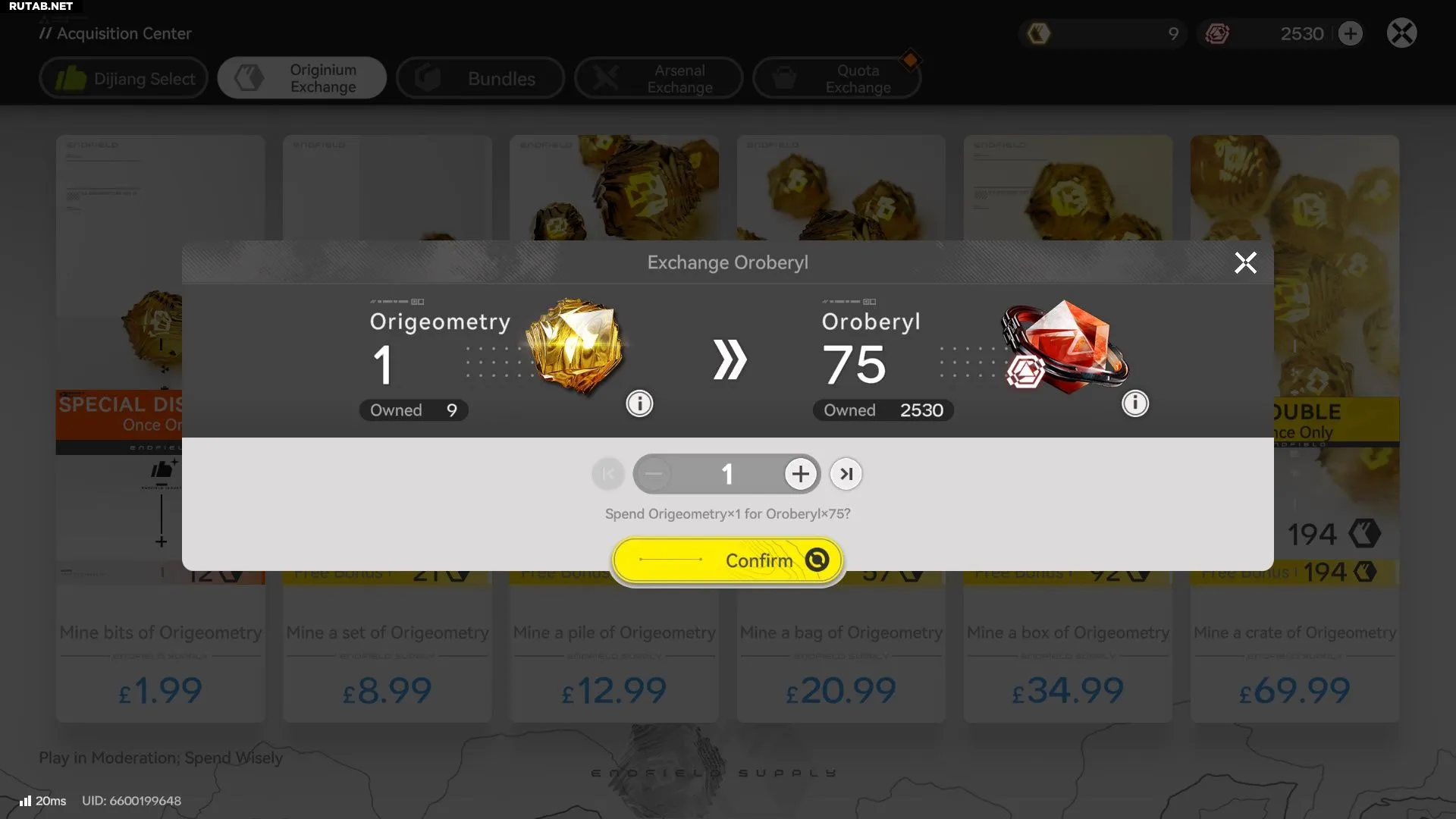 Основной способ получения Origeometry — покупка за реальные деньги во вкладке Originium Exchange магазина Acquisition Center. Также можно приобрести трек Originium Supply или Protocol Customized в Протокольном пропуске (Protocol Pass), чтобы разблокировать Origeometry по мере выполнения миссий боевого пропуска и повышения его уровня.