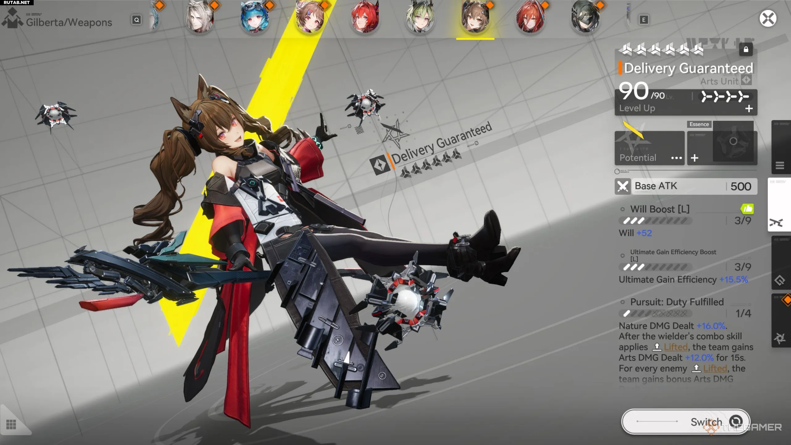 | Гарантированная доставка | 6 звезд | Воля, Эффективность ульты, Преследование | Эффективность ульты уже делает это оружие отличным для Гилберты, но оно также даёт огромный бонус к магическому урону всей команде, когда она его экипирована. Этот эффект срабатывает при наложении на врагов статуса «Поднятие», и сила бонуса растёт в зависимости от количества поражённых целей. |