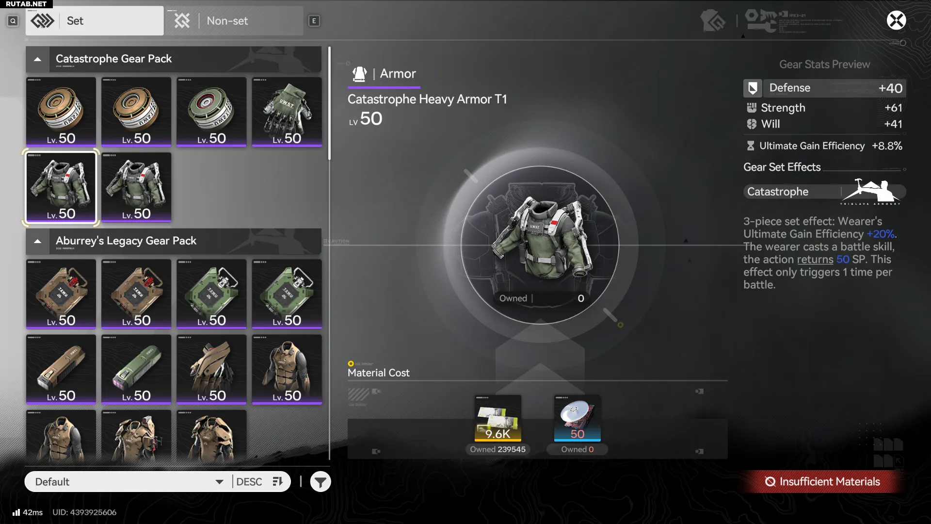 | Catastrophe Set (Фиолетовый) | Улучшает эффективность набора шкалы ультимативной способности. При первом использовании Боевого навыка в бою восстанавливает 50 SP. |