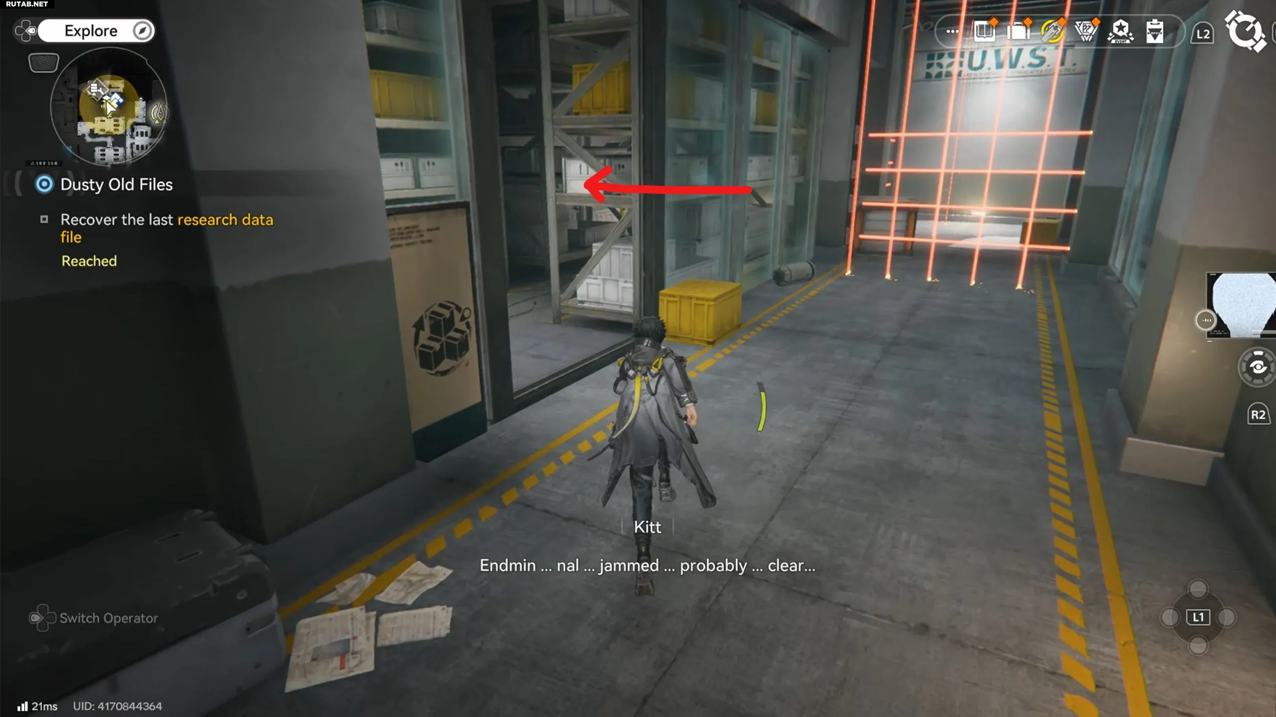 Откройте nearby сундук и следуйте за маркером задания за пределы лаборатории, чтобы восстановить связь с Киттом. Отправьте ему файлы, чтобы завершить квест «Пыльные архивы».