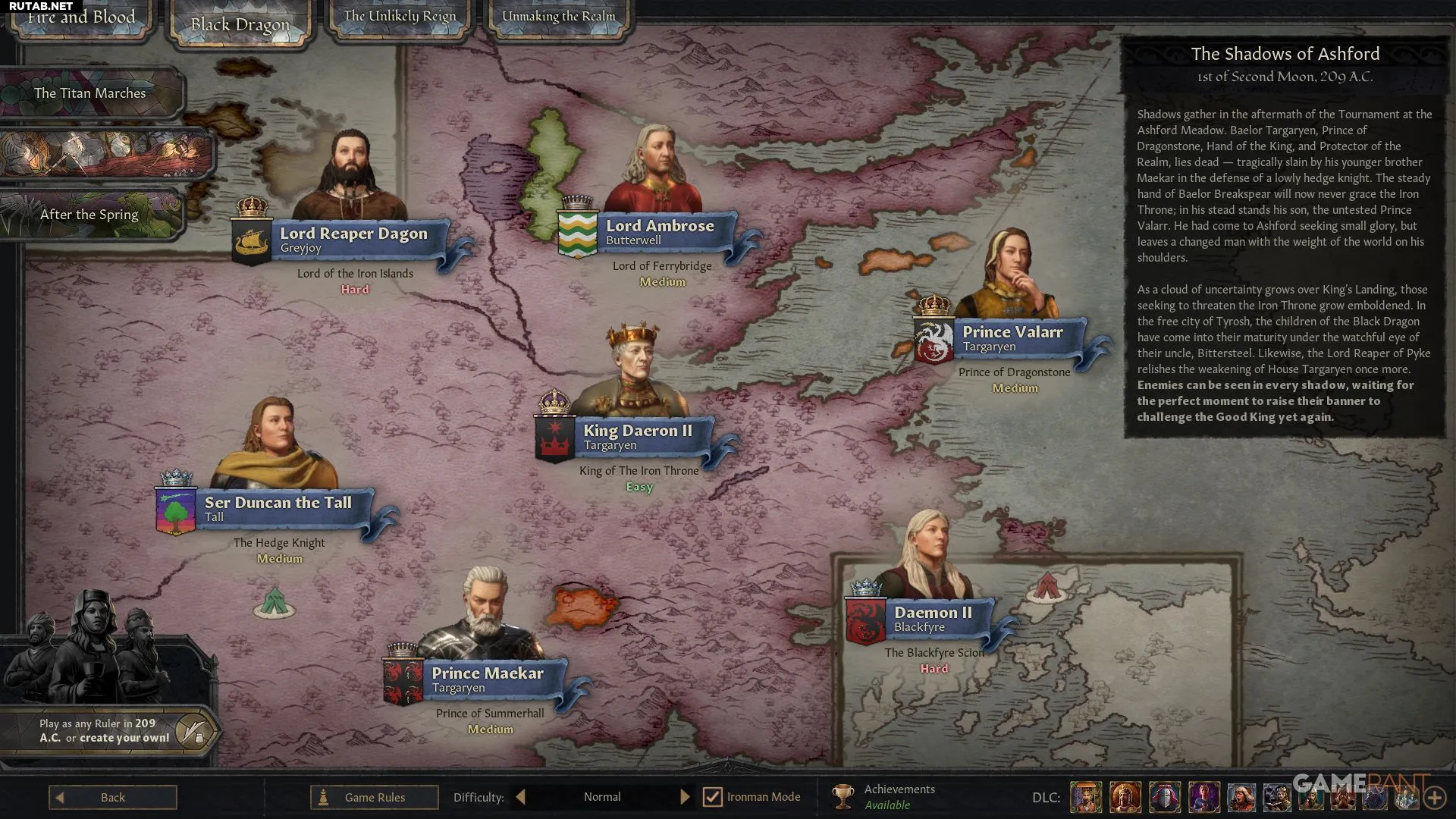Для тех, кто не хочет покупать DLC, в CK3 AGOT есть множество других отличных стартовых сценариев: можно сыграть за Неда Старка, Рейениру Таргариен или Роберта Баратеона. В других закладках книг даже присутствуют драконы.