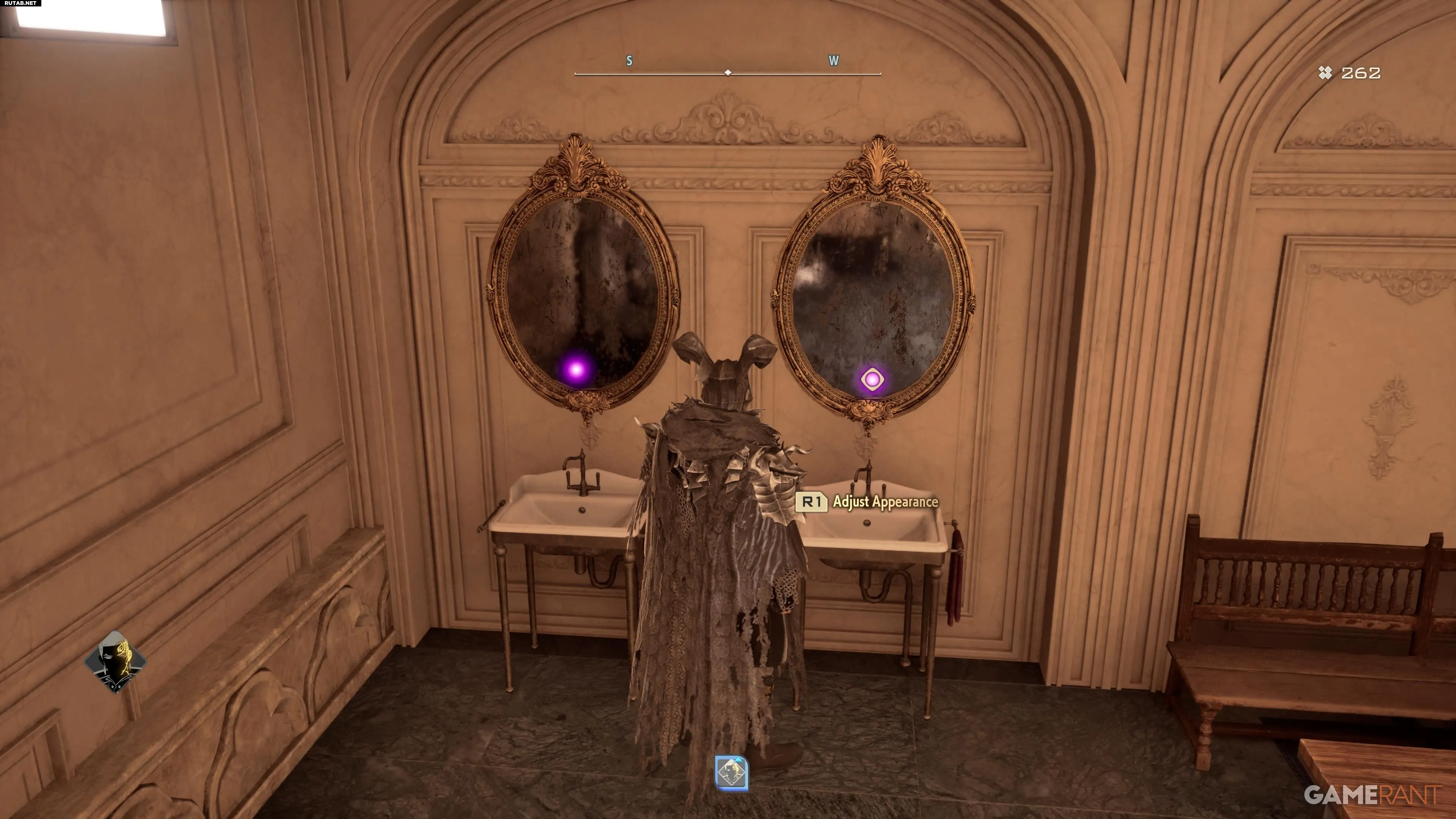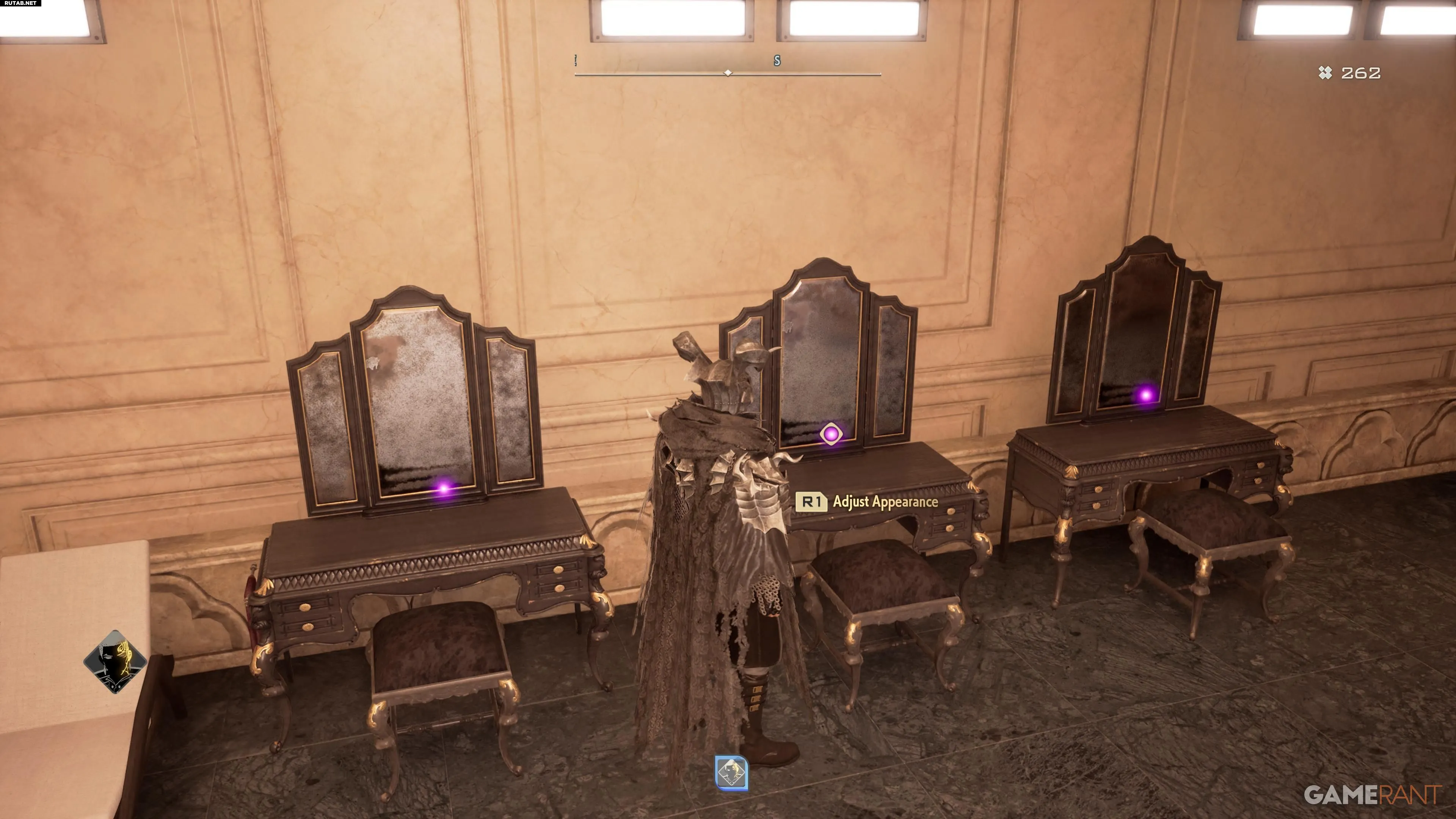 Продолжайте идти по пути и сверните на первом повороте налево. Вы увидите синюю занавеску в дверном проёме. Пройдите через неё, и в комнате вы найдёте несколько зеркал. Взаимодействуйте с любым из этих столов, чтобы открыть меню изменения внешности.