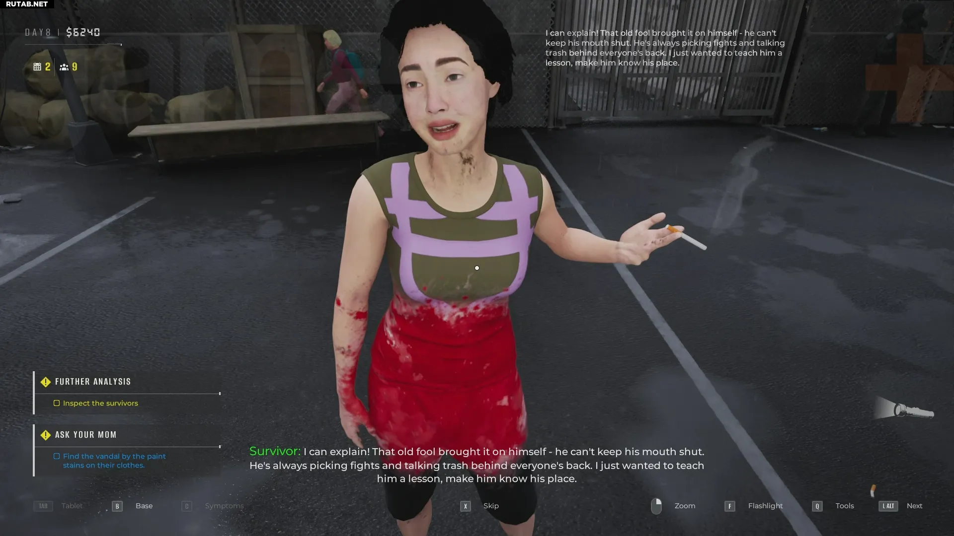 Вандалом может оказаться любой из выживших (это определяется случайно), но выявить его несложно — под светом вашего фонарика на нём будут видны красные пятна краски. После того как вы раскроете его мотивы, он пообещает вернуть краску и предложит взятку, чтобы вы не докладывали о нём.