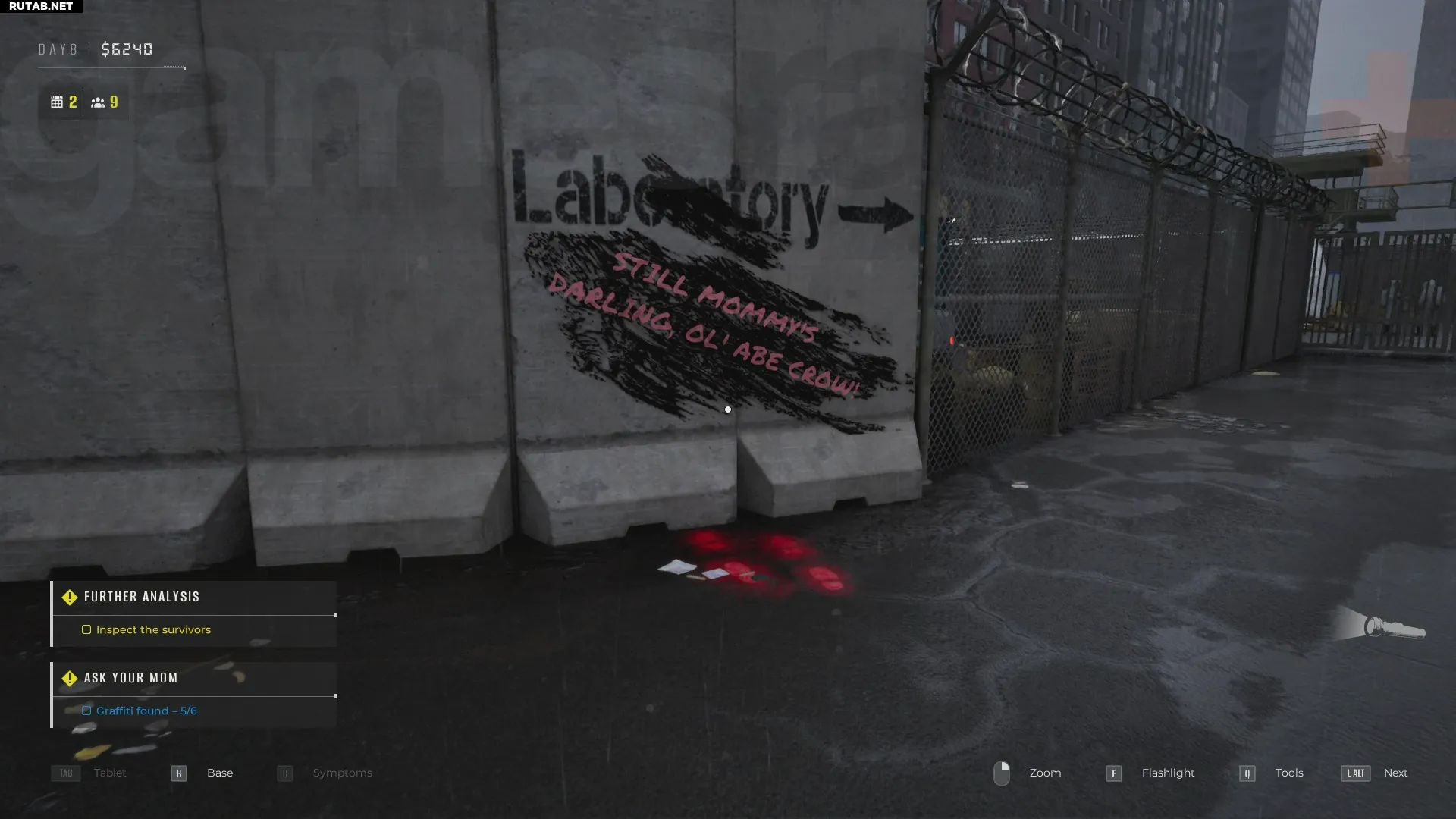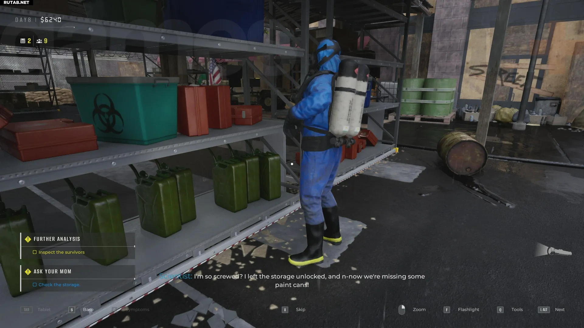 Внутри на складе, возле стеллажей, вы найдёте учёного, который переживает, что забыл запереть помещение, и теперь пропали несколько банок с краской. Он сообщает, что эту краску почти невозможно смыть, и она проявляется под светом фонарика. С этой информацией возвращайтесь в Блок выживших, чтобы найти вандала.