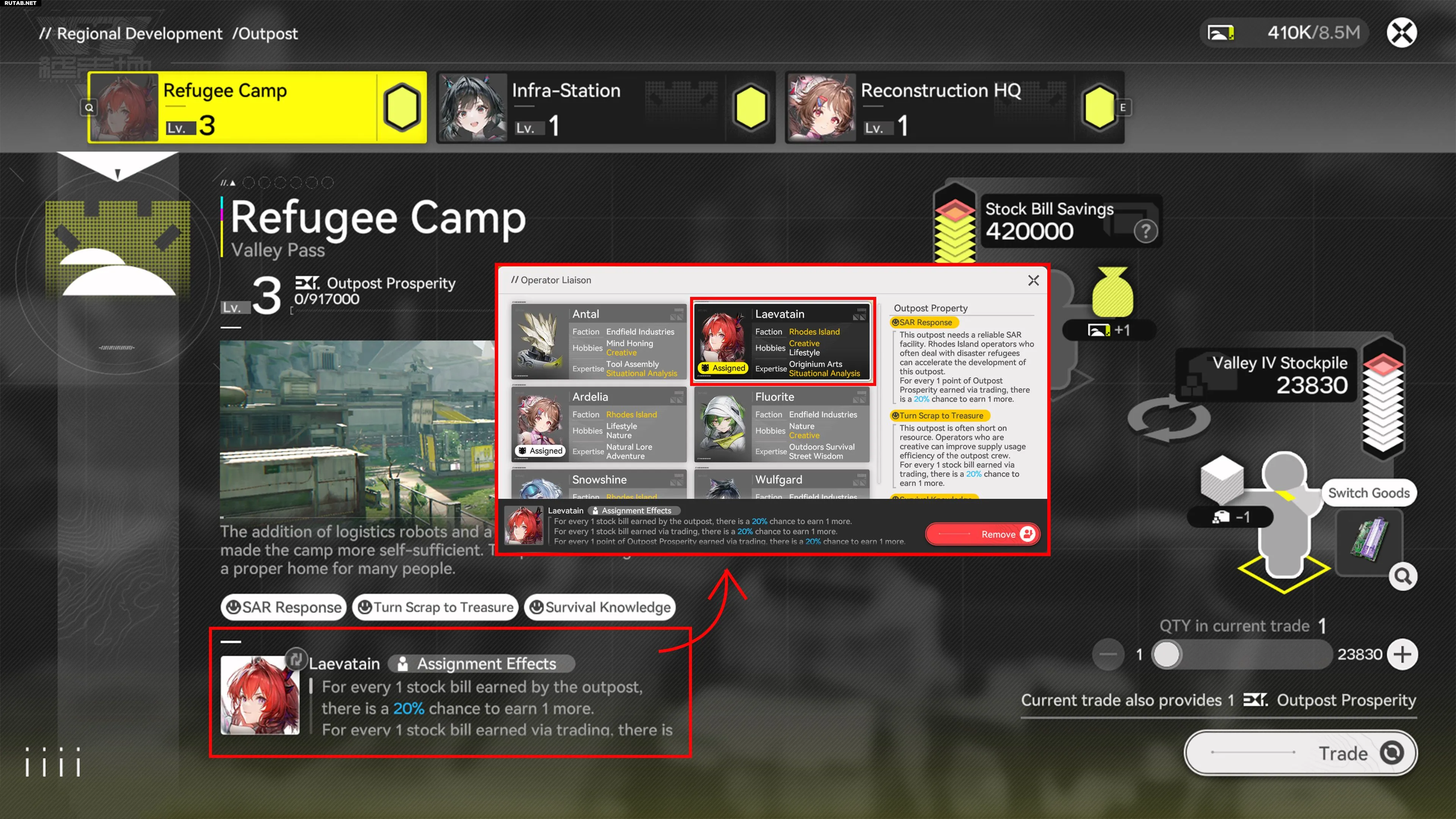 Перед началом торговли убедитесь, что вы назначили оператора, который соответствует специализации аванпоста, затем выберите товары для продажи и нажмите «Обменять». Учтите, что каждый регион покупает разные товары, а цена каждого материала зависит от сложности его изготовления. Чтобы повысить уровень процветания аванпоста, торгуйте с купцами чаще и выполняйте назначенные задания.