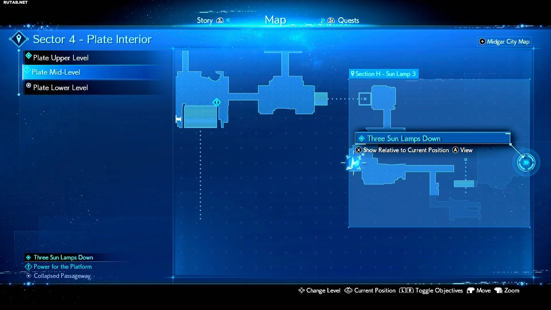 В этой главе вы будете отключать три больших Солнечных Фонаря, чтобы двигать мосты и открывать двери. Зона состоит из трёх уровней по высоте (Верхний, Средний, Нижний) и разделена на секции, обозначенные буквой и цифрой (например, G-05).