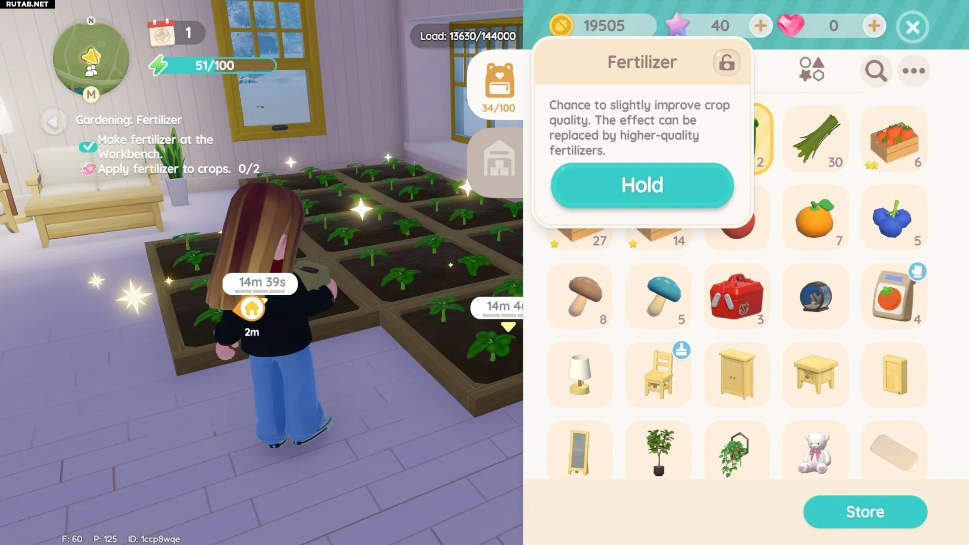 Использовать удобрение нужно так же, как сажать культуры. Откройте инвентарь, нажмите на иконку удобрения и выберите «Держать». Это поместит мешок с удобрением вам в руки.