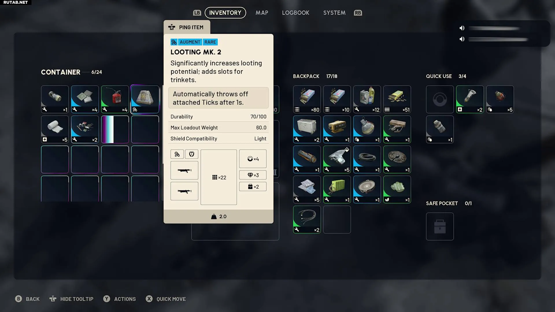 | Looting Mk.3 (Safekeeper) | Лимит веса: 65 Слоты рюкзака: 18 Слоты быстрого доступа: 4 Усиленные слоты для безделушек: 2 Безопасный карман: 1 |