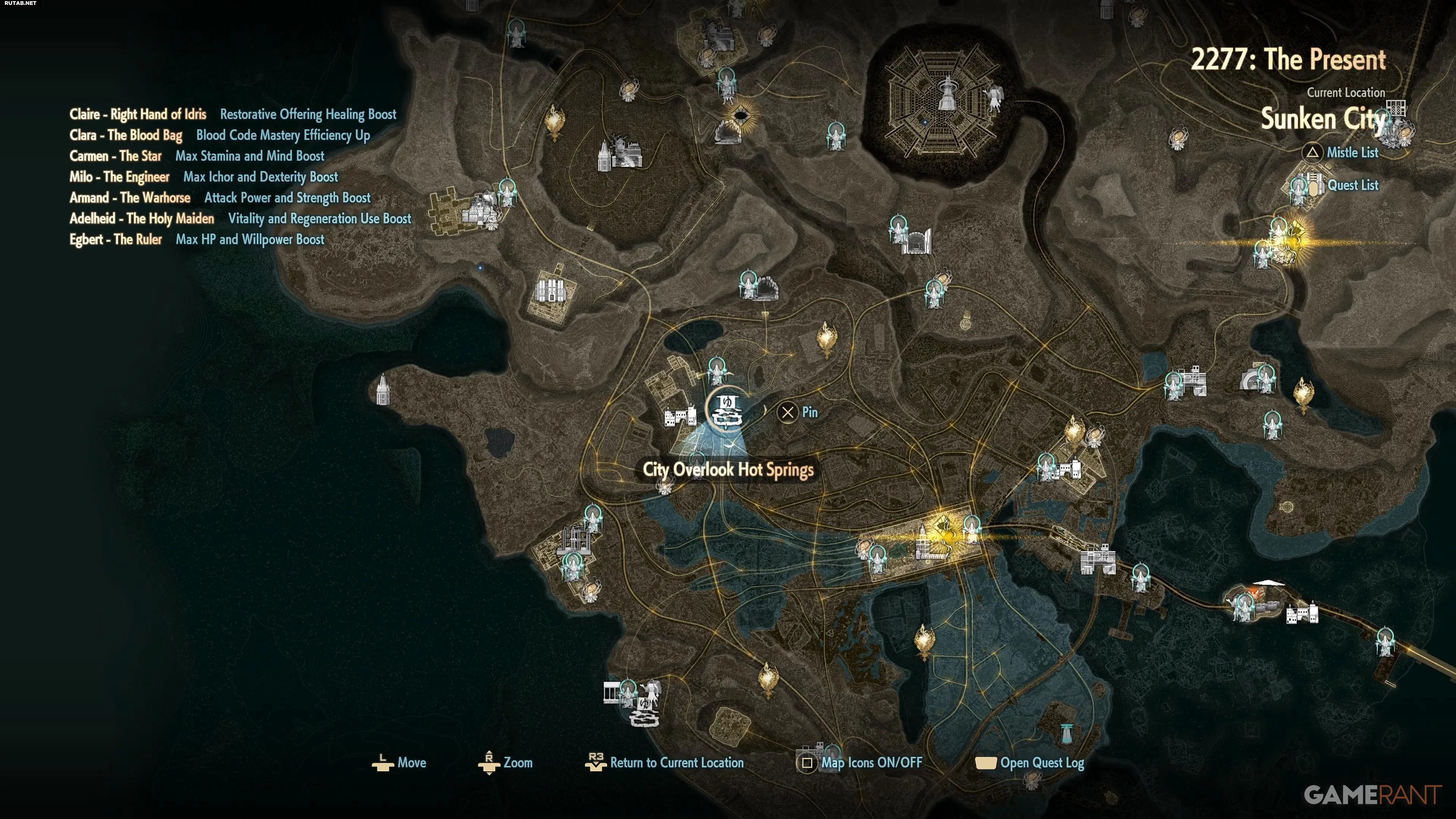 Для этого нужно добраться до Мистла «Привал шахтёров», который находится рядом с Башней регенерации (там можно найти Золотую кровяную жемчужину для усиления восстановления). Двигайтесь отсюда на север по дороге — источник будет справа от вас.