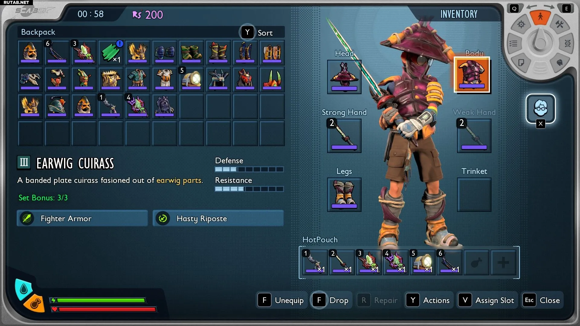 Комплект «Ржавый» относится к классу магической брони и снижает затраты выносливости на атаки посохами. Он обеспечивает высокое сопротивление ценой более низкого показателя защиты. Его рецепт открывается после анализа Частей ржавого жука или Кислого сгустка. Этот комплект отлично сочетается с новыми посохами Танга, такими как «Кислотная погибель» или «Жало увядания».