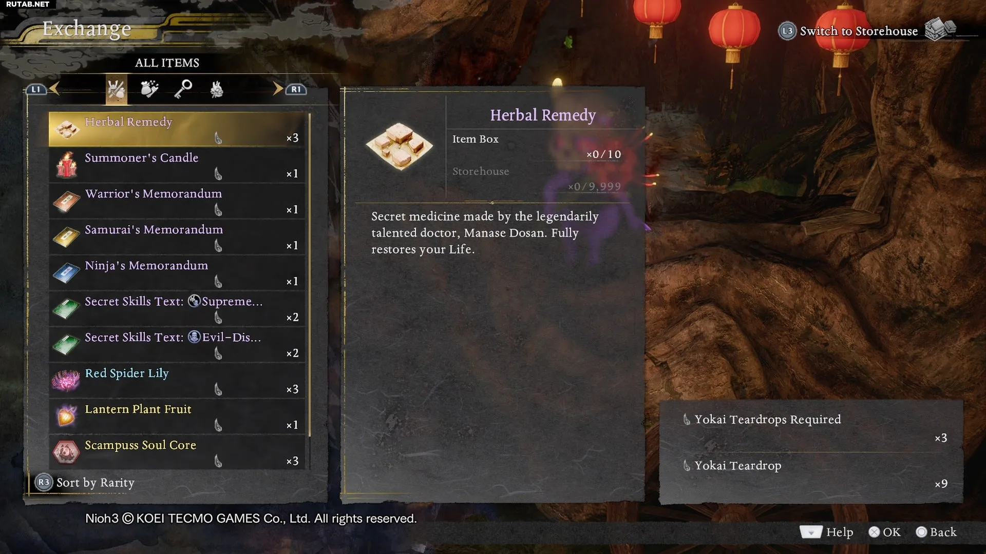 Помимо покупки обычных товаров (патроны, амулеты) за золото, у торговцев есть меню «Обмен». Здесь за Слёзы Ёкаев можно приобрести редкие предметы: меморандумы, тексты секретных навыков, а также расходники вроде Плода фонарного растения или Свечи призывателя.