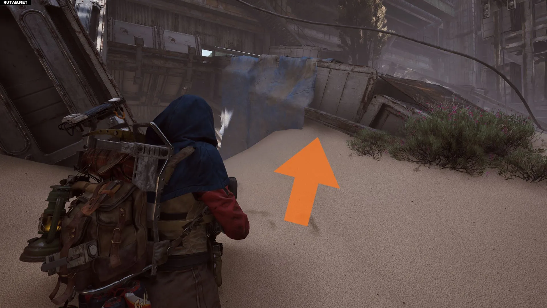 Наконец, контейнер под брезентом тоже находится неподалёку. Спуститесь по zip-line обратно на нижний уровень «Контейнерного склада». Неподалёку, глубоко в песке, вы найдёте контейнер, накрытый брезентом. Подойдите к нему и нанесите метку, чтобы завершить квест.