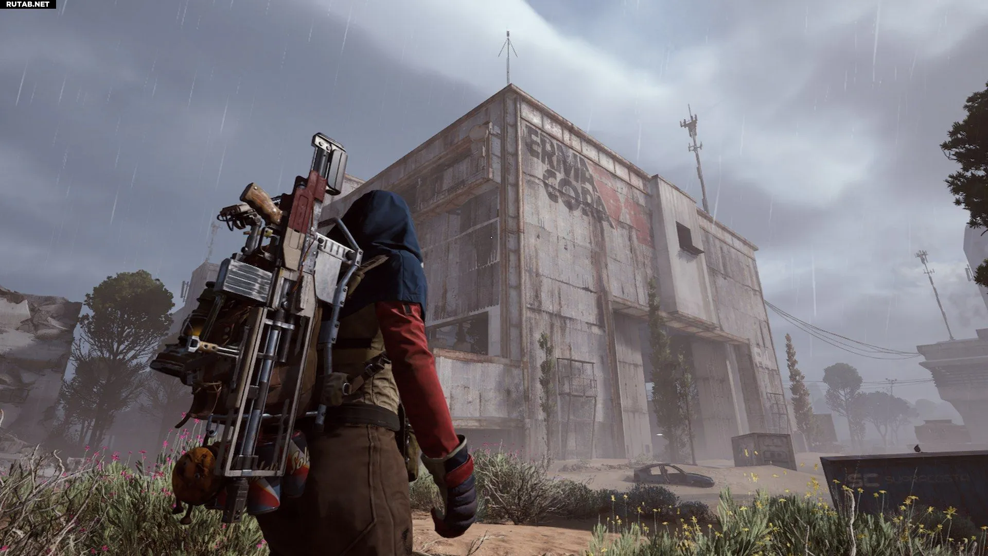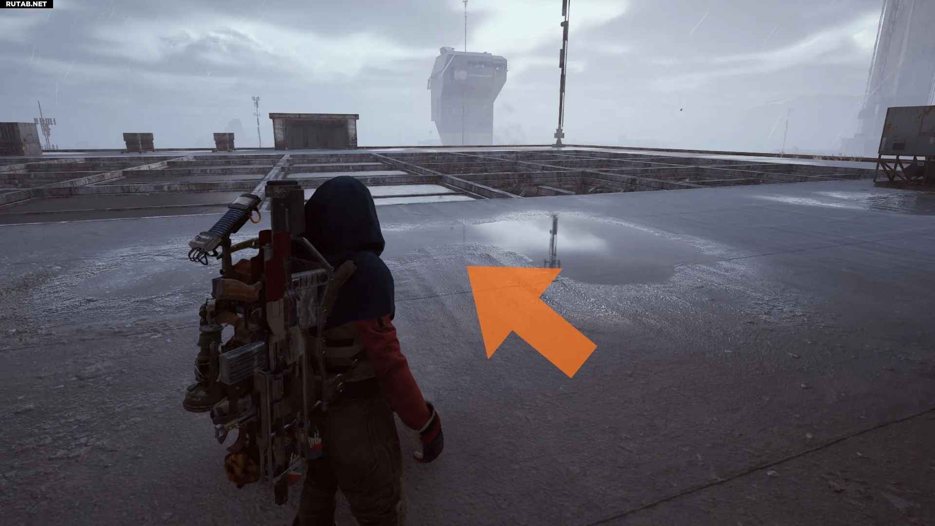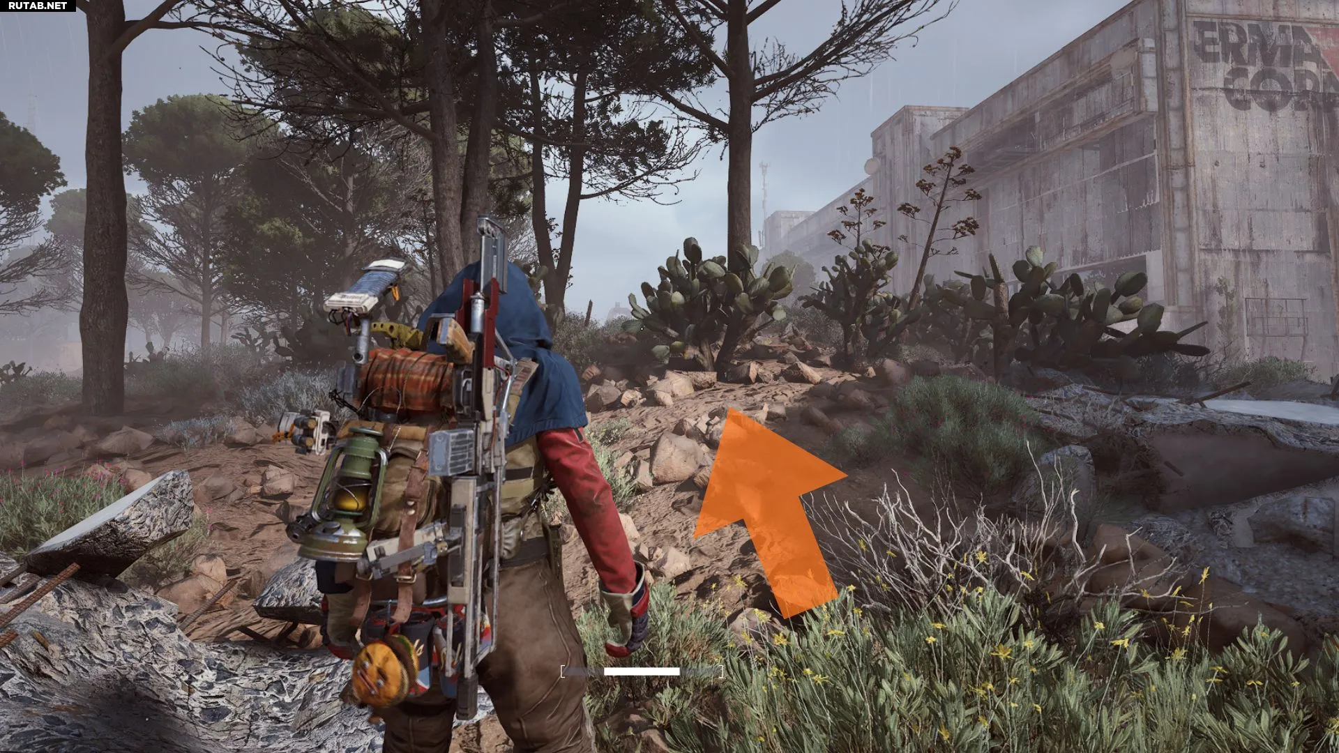 Идите к середине, где крупные трубы упали на землю — там появится возможность взаимодействия.