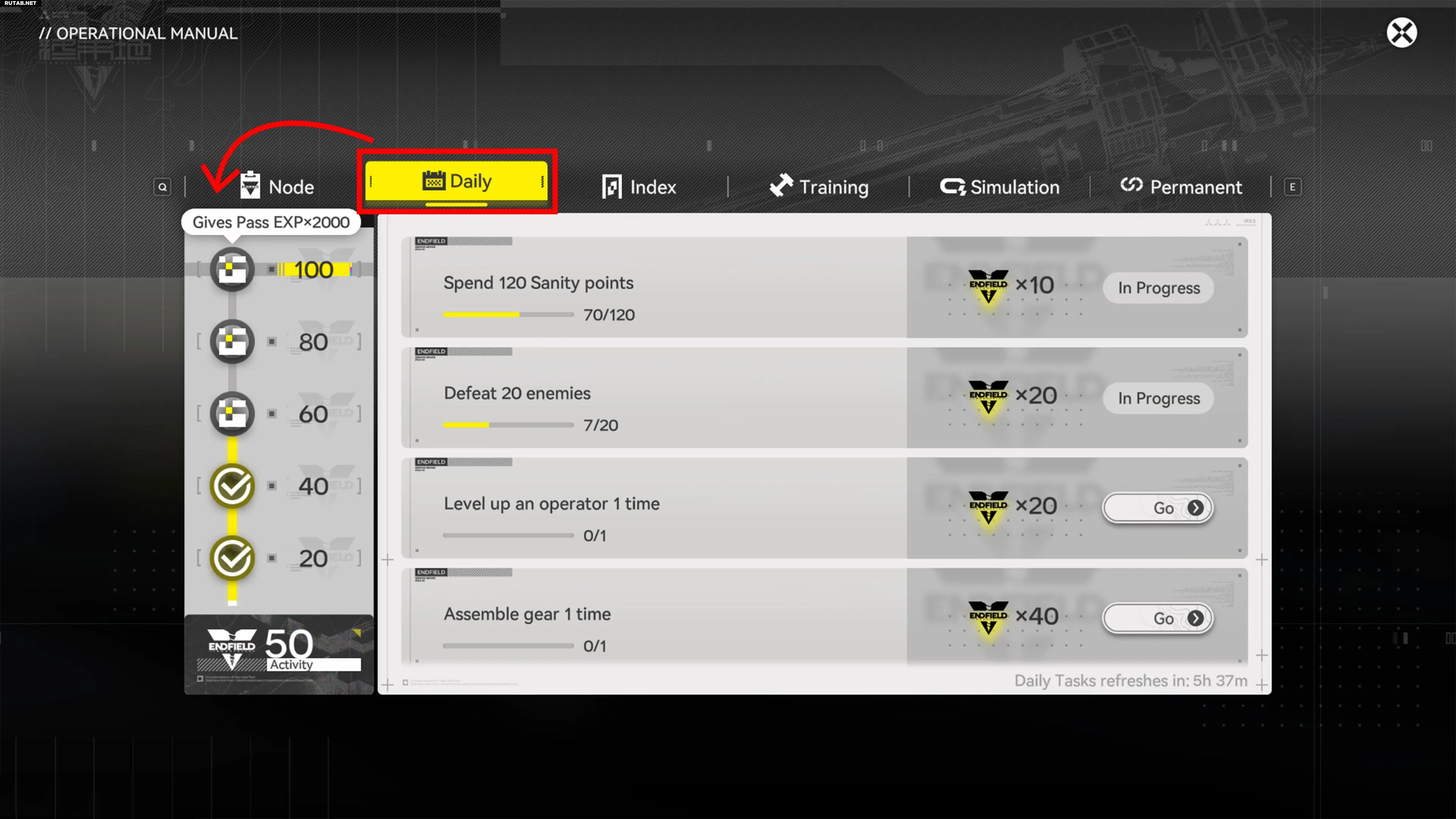 Чтобы выполнить ежедневные задания в Arknights: Endfield, откройте меню Операционного руководства (иконка планшета в правом верхнем углу экрана) и убедитесь, что достигли 100 единиц Активности.