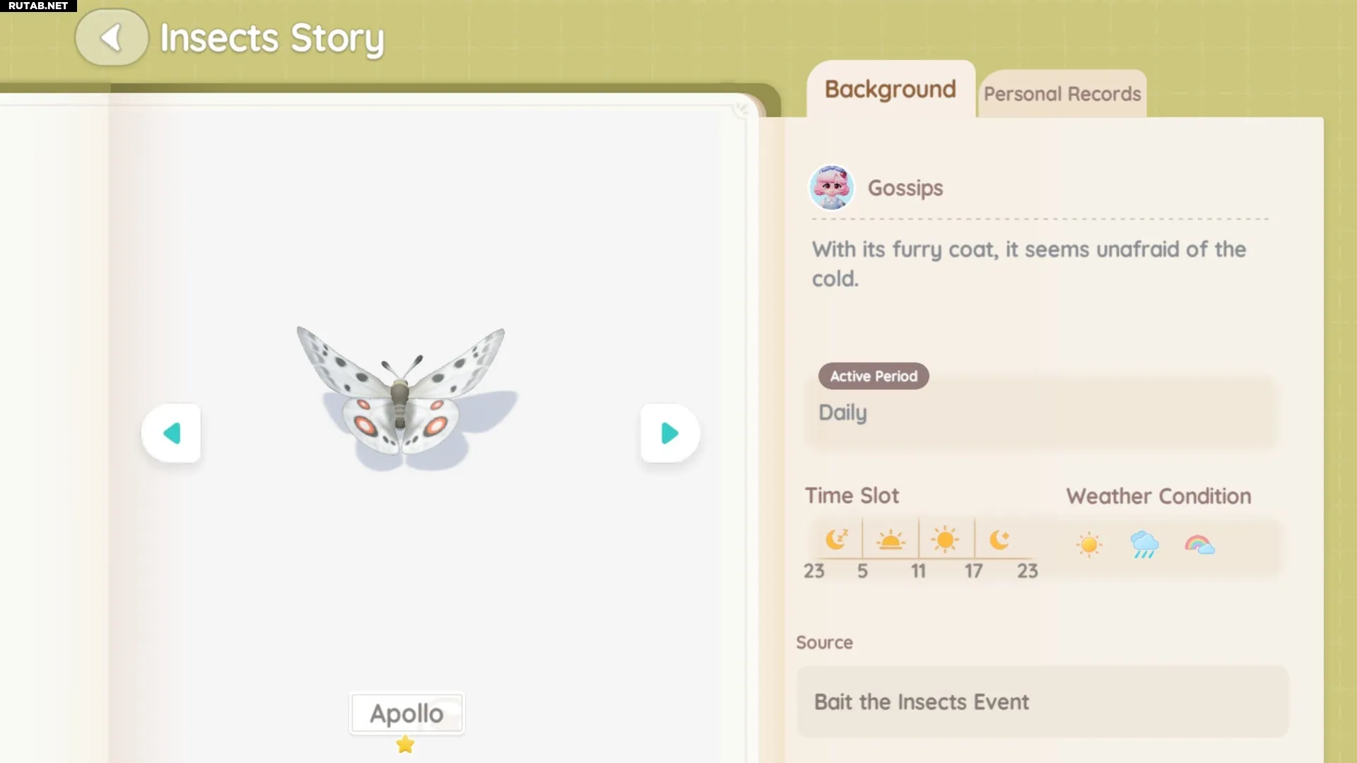 Это насекомое обитает в строго определённой локации, что значительно упрощает его поиск. Однако для его появления требуется участие в специальном событии. Поимка Аполлона поможет вам в развитии хобби «Ловля насекомых».