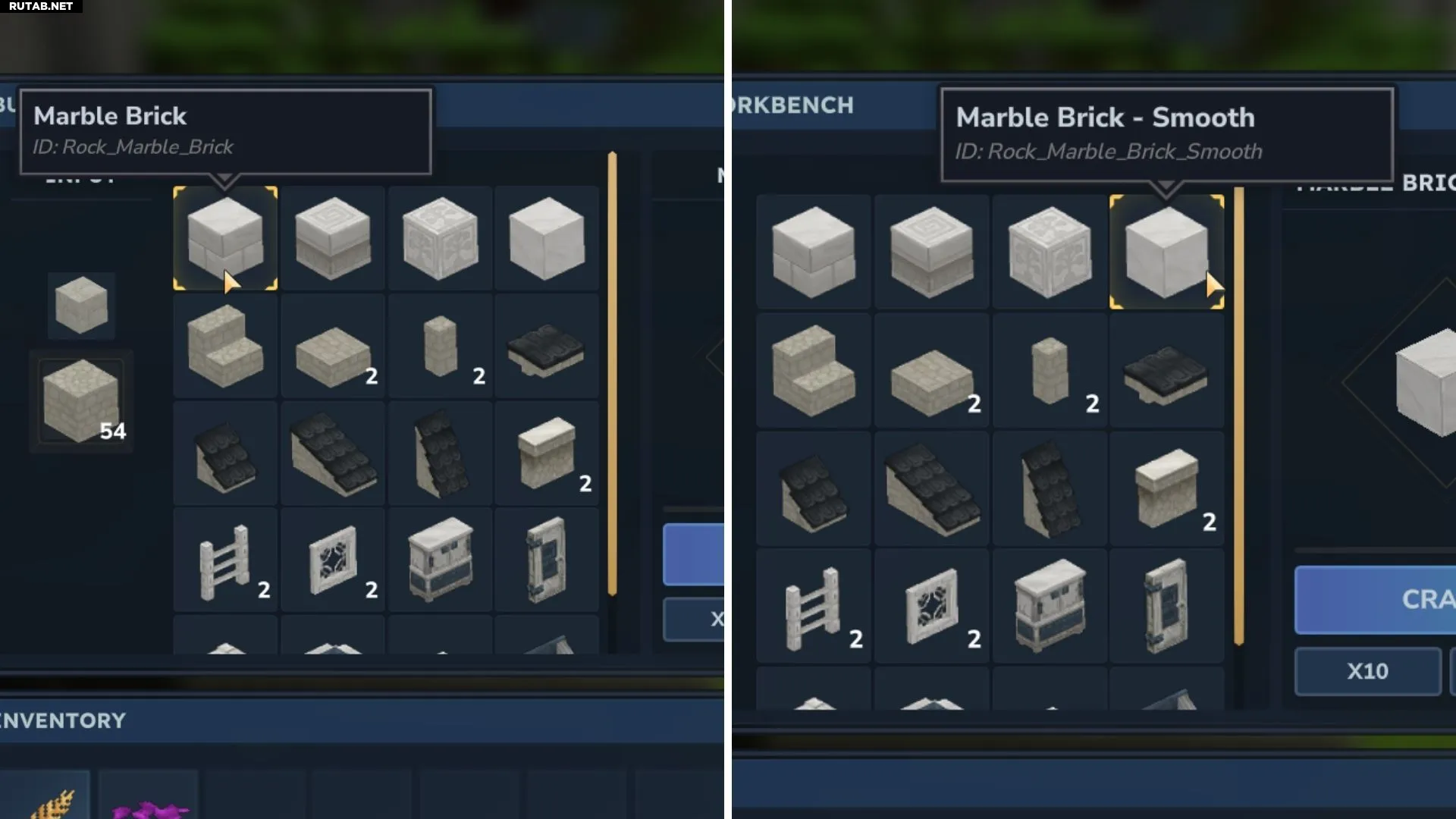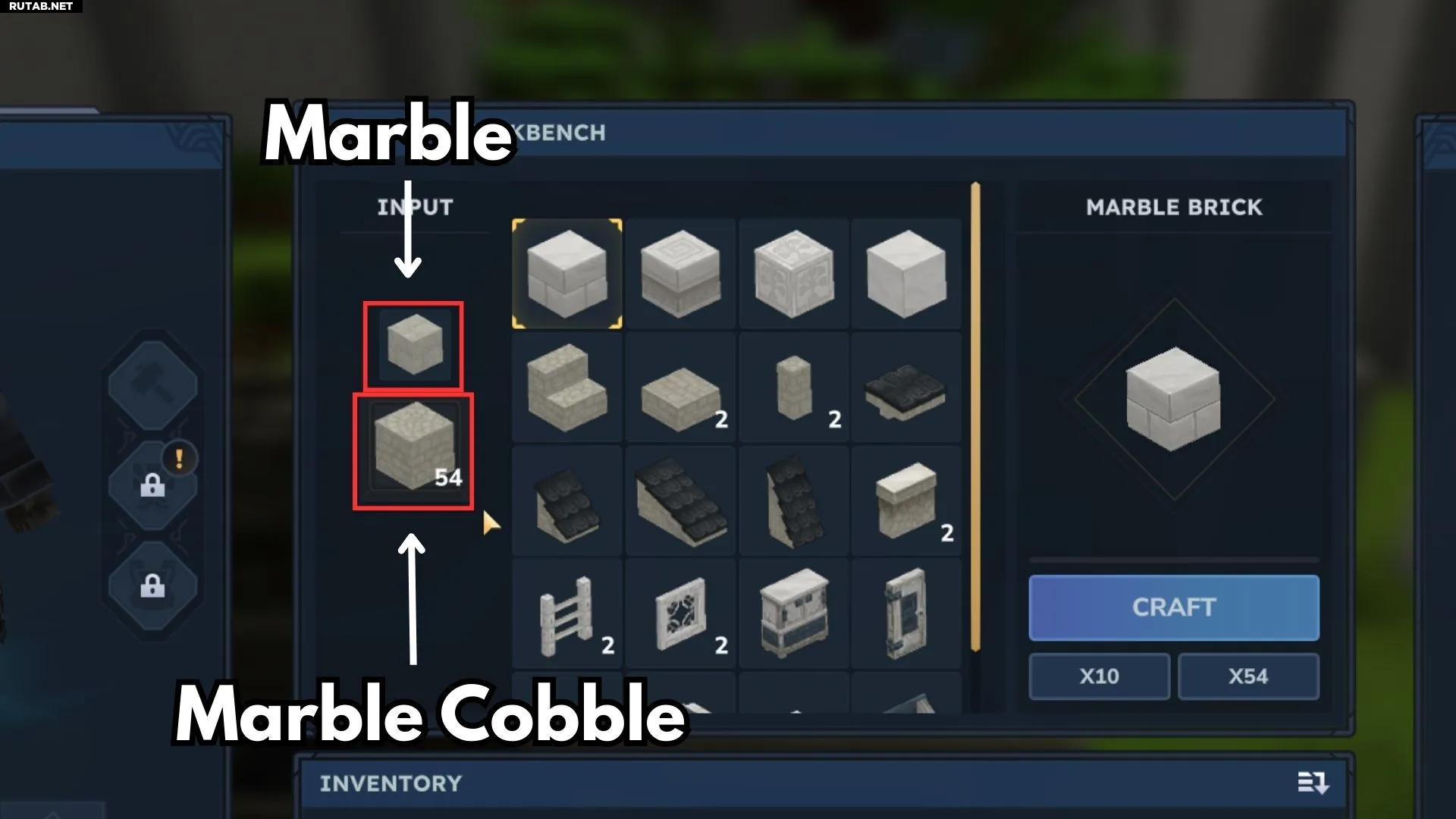 Откройте верстак строителя и перетащите Булыжник Мрамора в раздел для сырья. Появятся два варианта блоков мрамора: один — булыжник, другой — чистый мрамор.