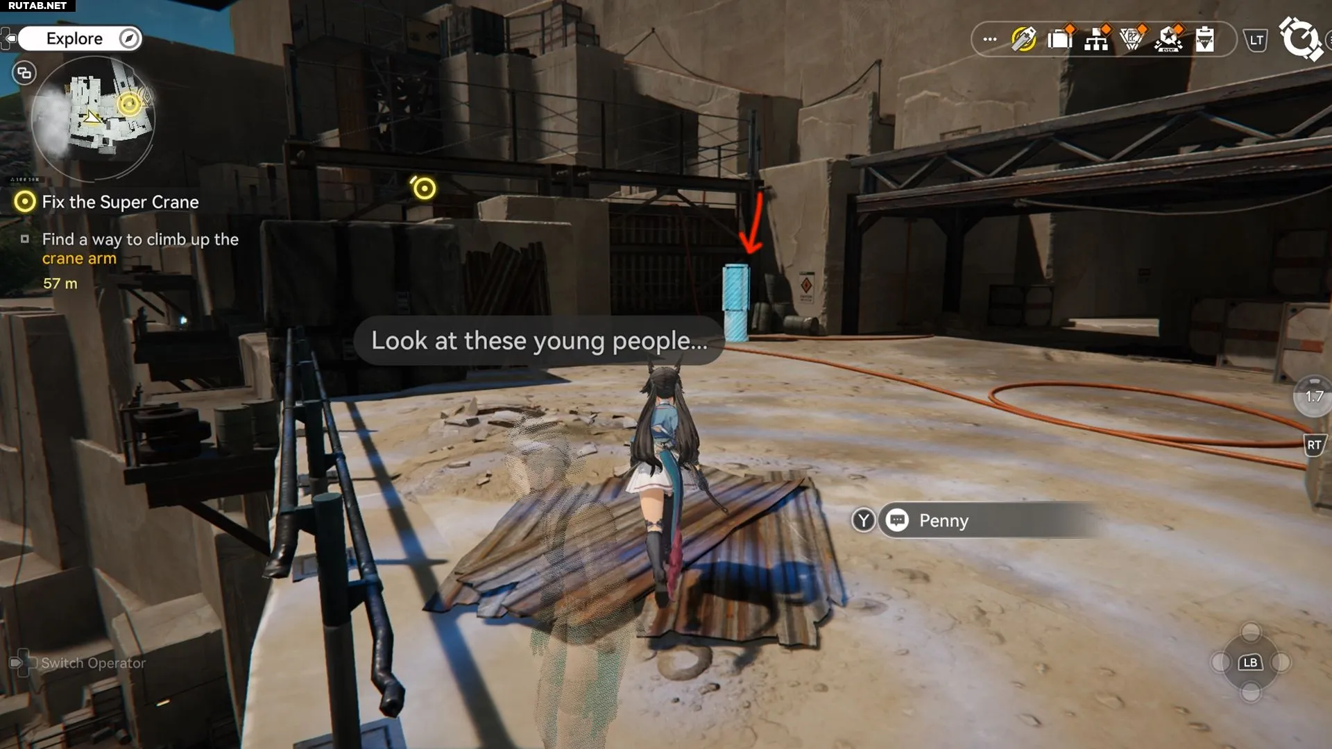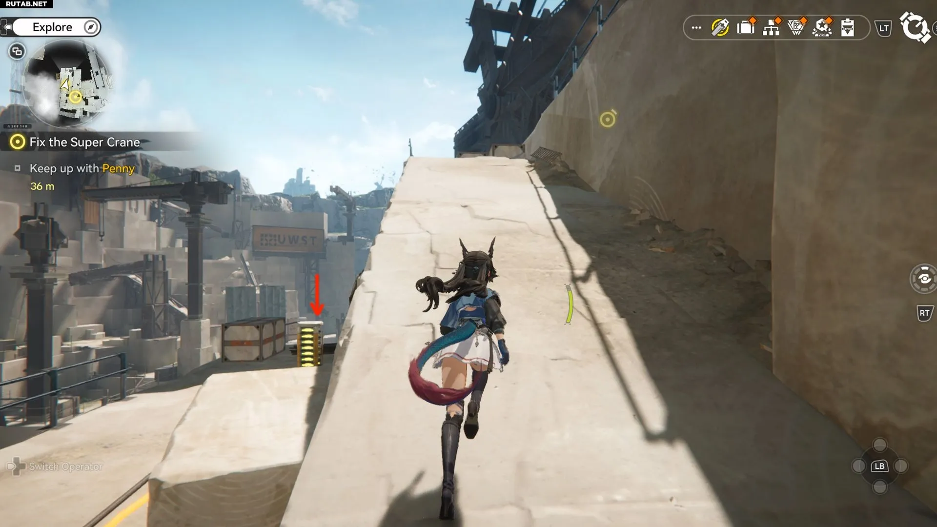 Следуйте за маркером к прыжковой платформе и взберитесь по стреле крана.
