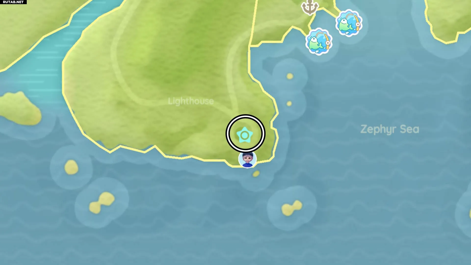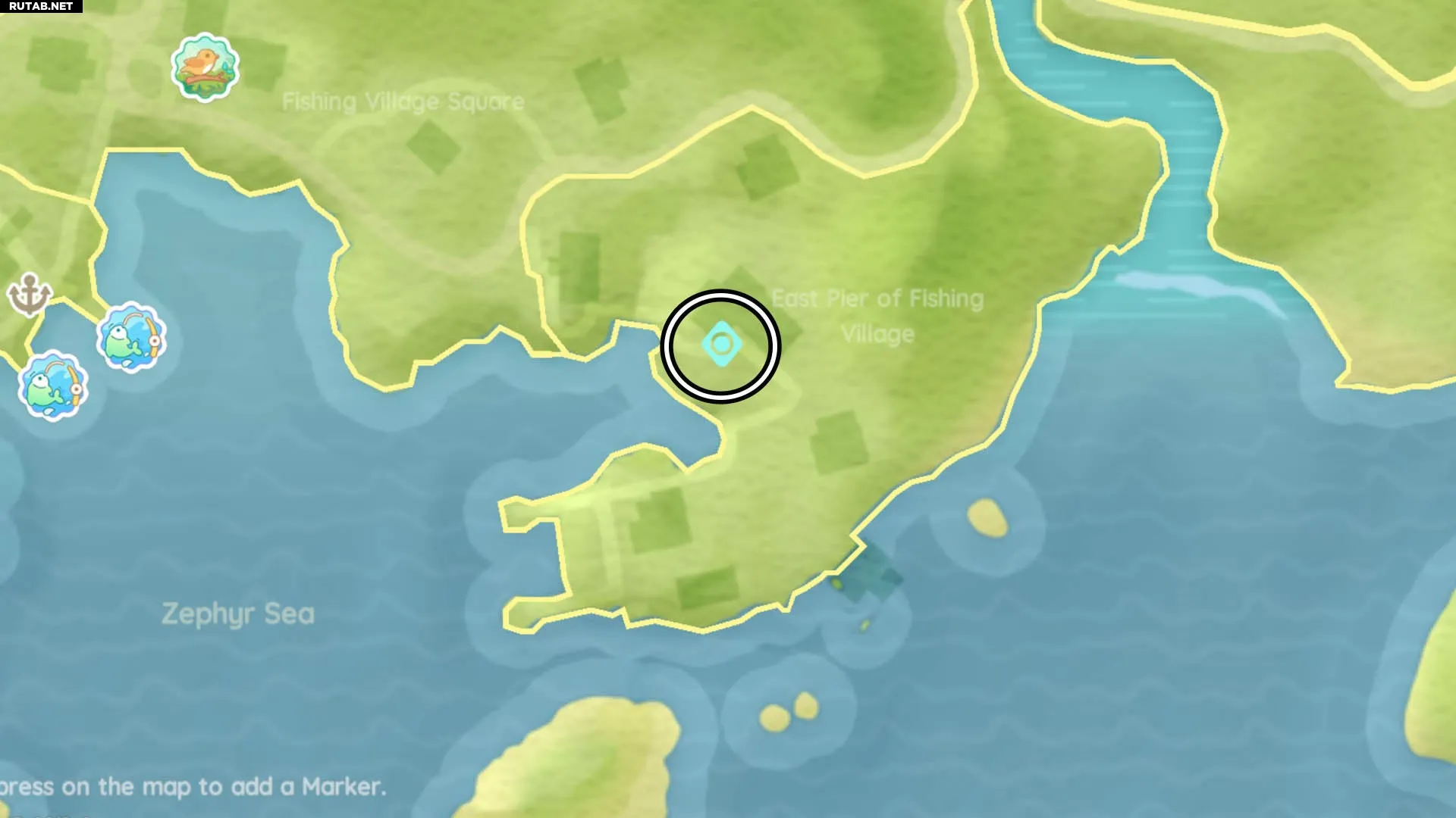 Следующий Снеговик-пузырь находится на крыше крыльца маяка в Рыбацкой деревне. Мы отметили это место на карте ниже: