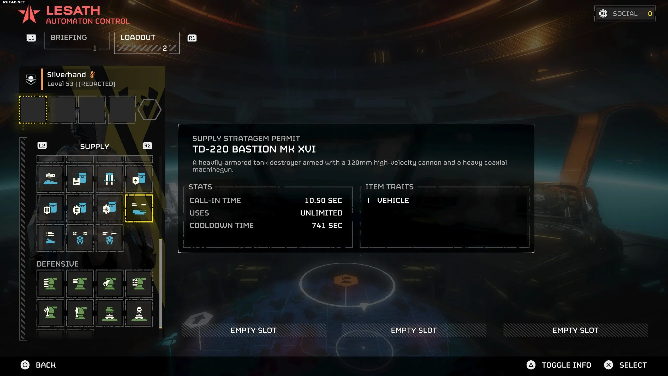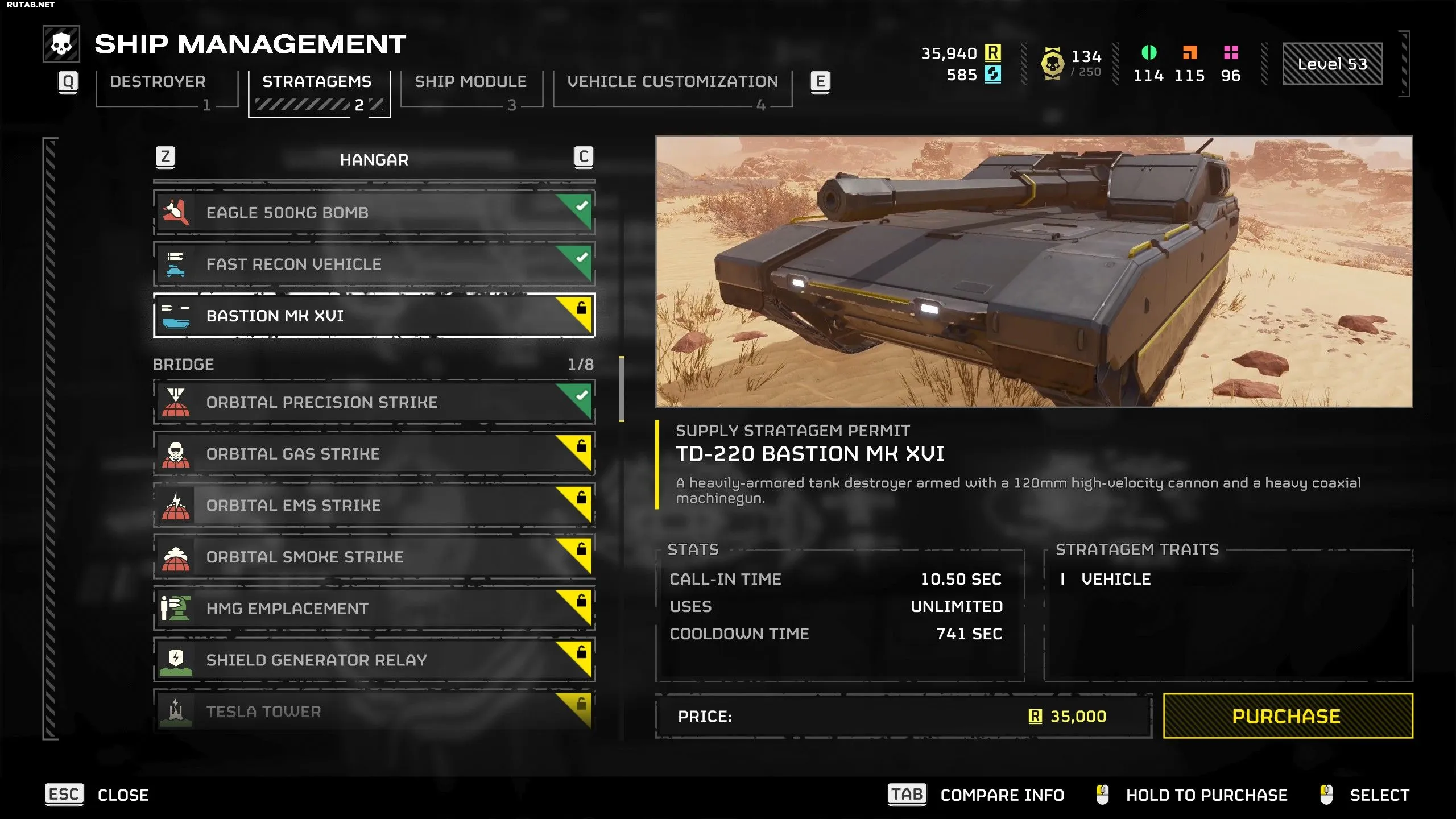 Танк в Helldivers 2 можно приобрести за 35 000 ордерных талонов в меню управления кораблём. Для покупки «Бастиона» не требуется боевой пропуск, он находится в разделе стратегем ангара. Затем, собирая снаряжение для миссии, вы найдёте танк в категории «Снабжение» под названием TD-220 Bastion Mk XVI.