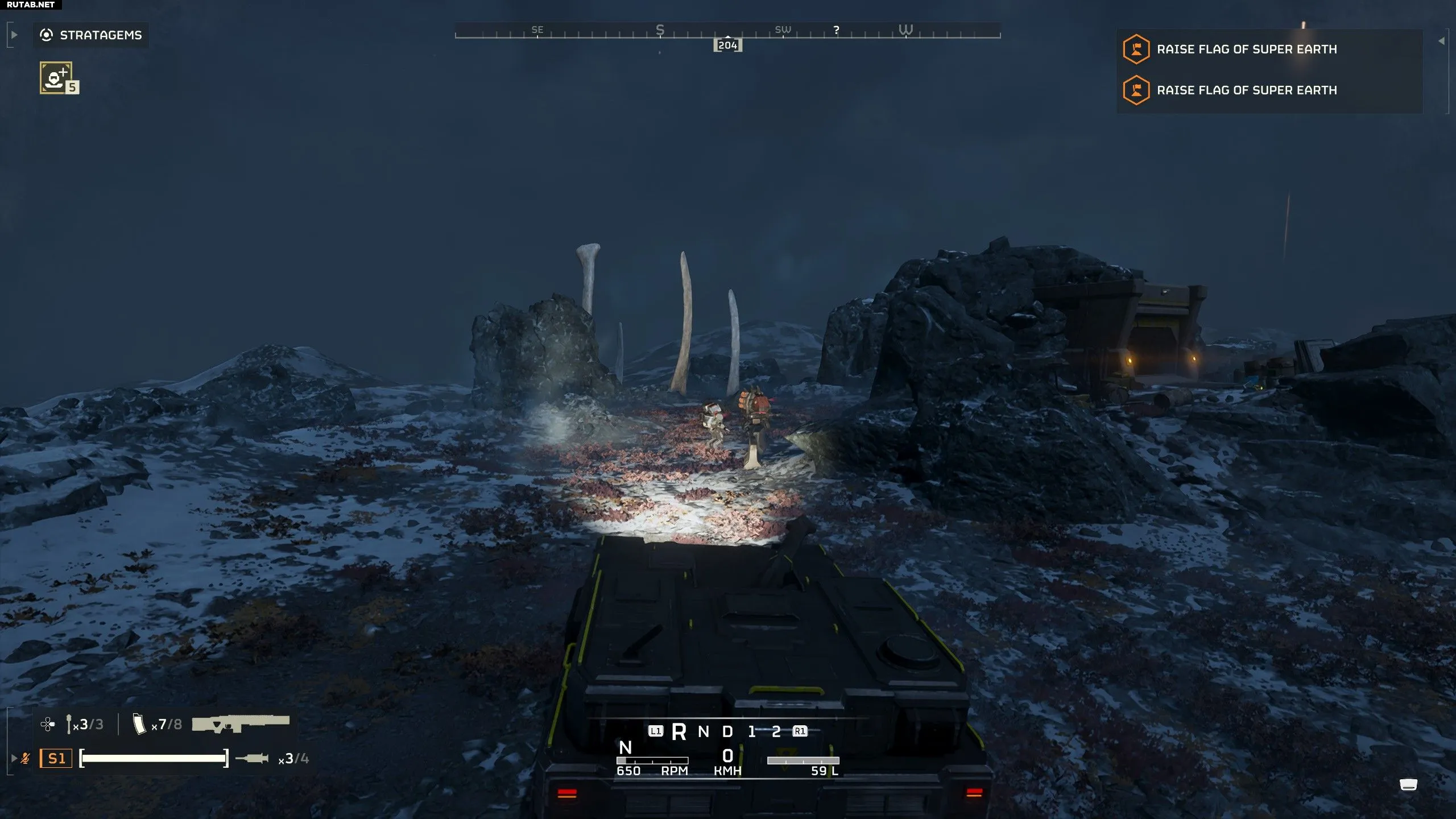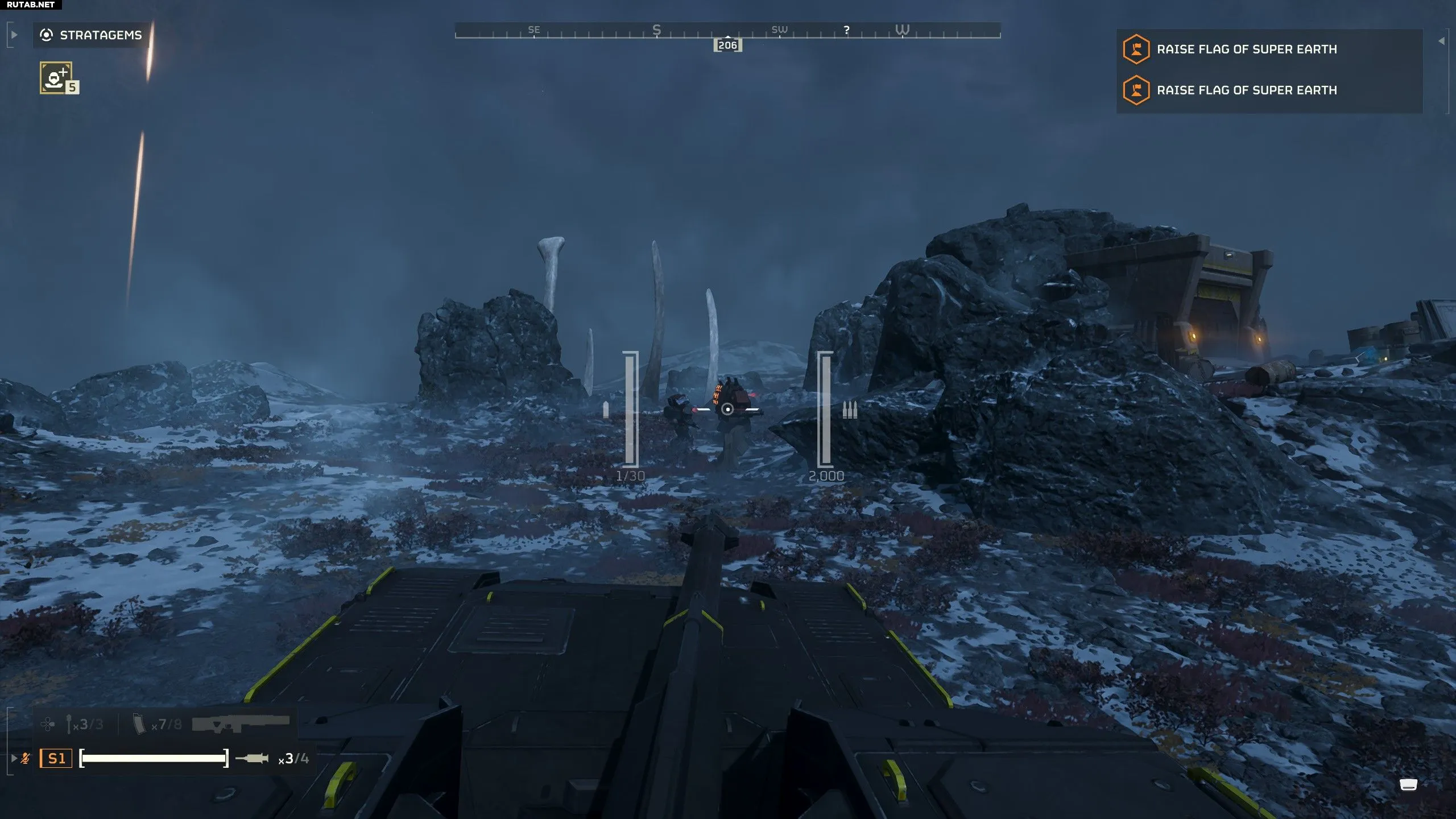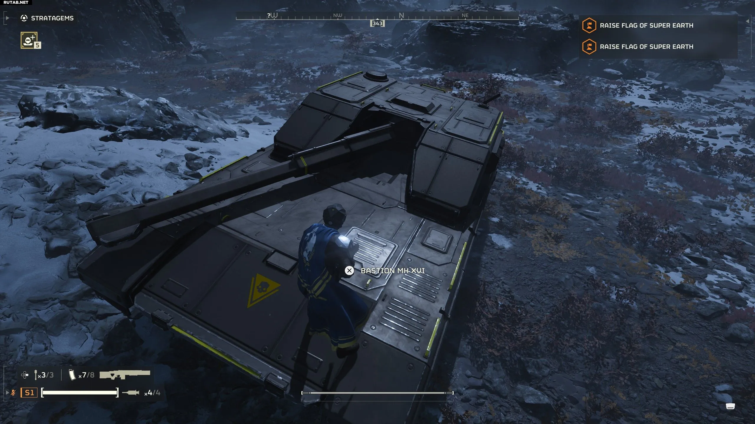 К сожалению, танк не рассчитан на одиночную игру. Чтобы одновременно управлять им и стрелять, потребуются два игрока: один спереди (водитель), другой сзади (наводчик). Это кооперативный стратегем, который лучше всего подходит для миссий по поиску и уничтожению, где пушкой можно стирать с лица земли вражеские лагеря.