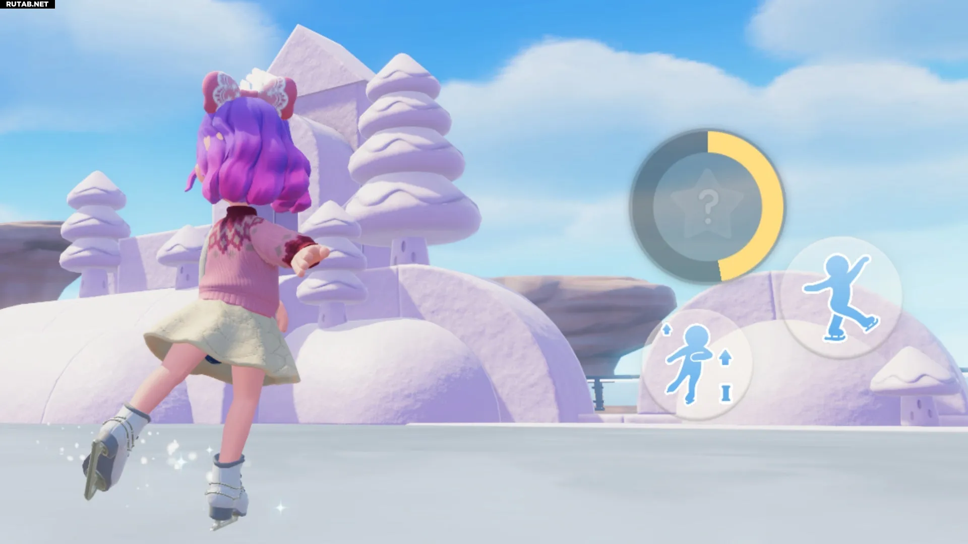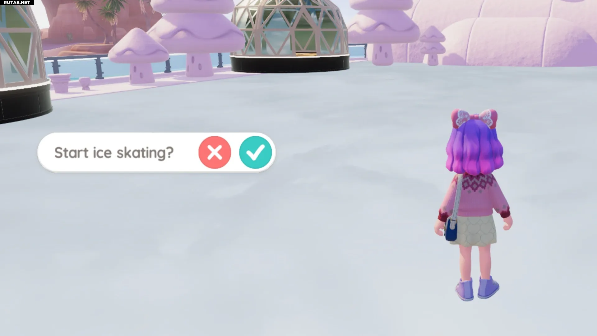 Чтобы встать на коньки, нужно отправиться на север горы Онсэн, на каток. Пройдите мимо ледяных горок и ступите на лёд. Появится окно с предложением начать катание — подтвердите действие зелёной галочкой.