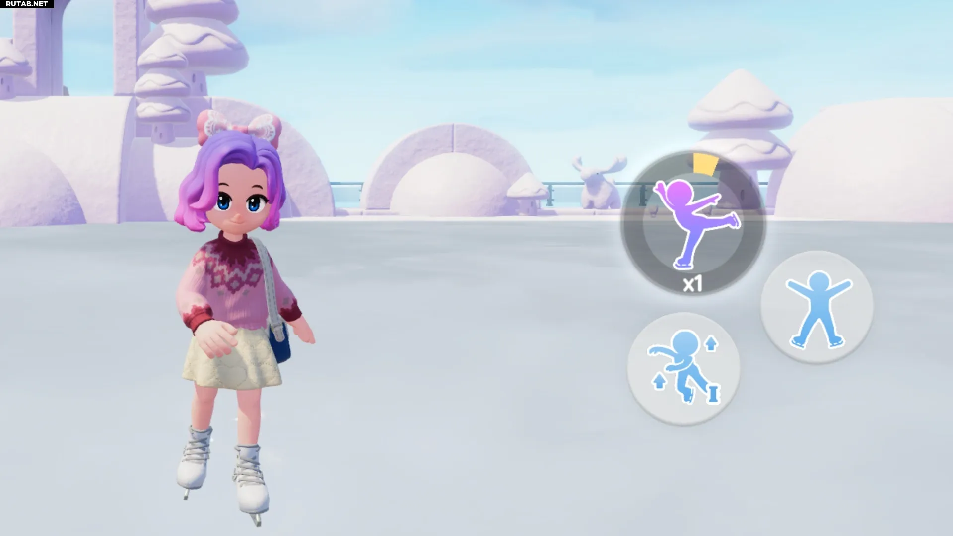 Надев коньки, вы сможете скользить по льду, используя обычное управление движением. Справа на экране появятся кнопки действий для выполнения специальных движений. Сначала доступны две маленькие кнопки и одна большая «загадочная» кнопка.