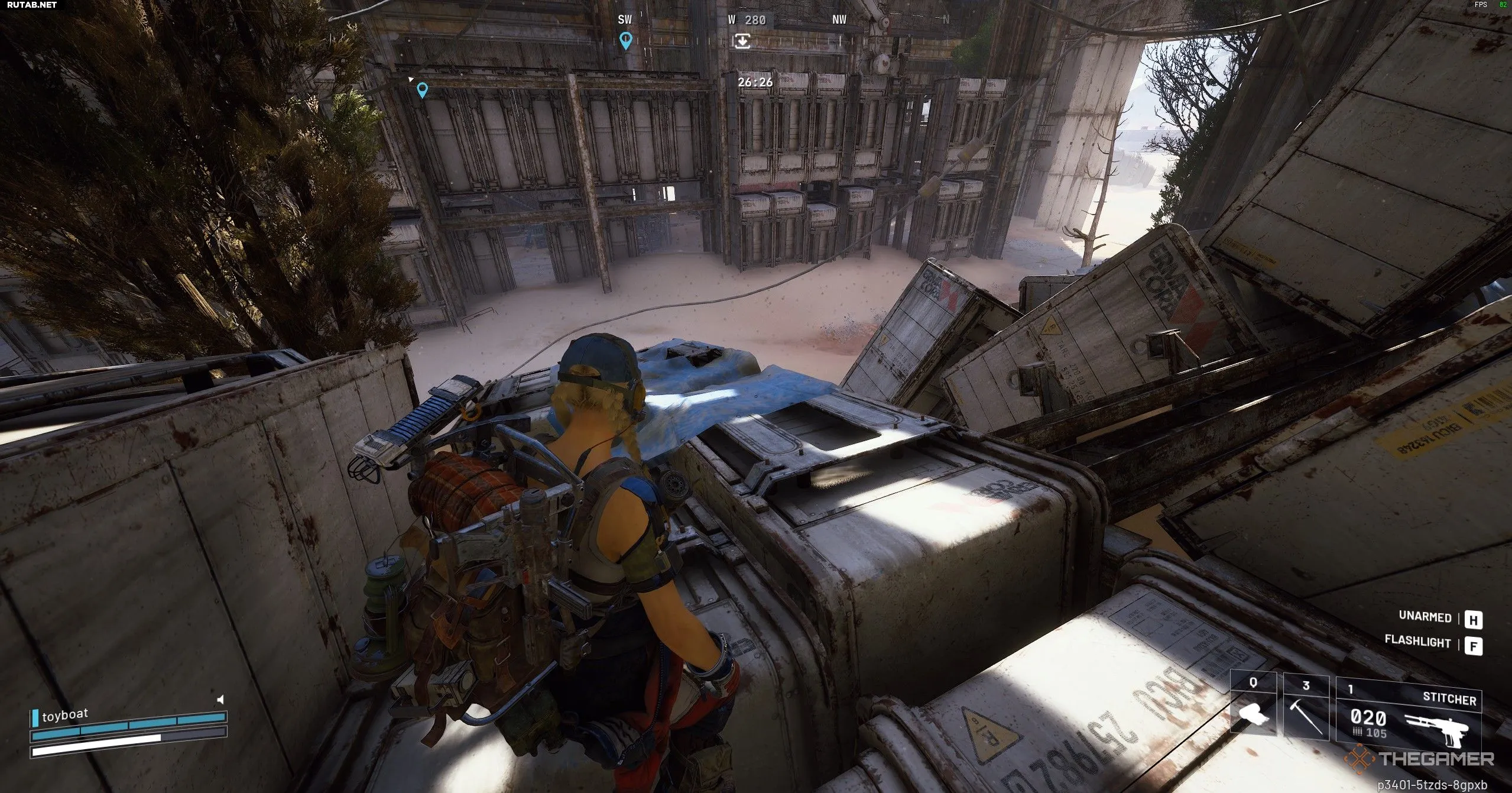 Поблизости вы увидите простой белый контейнер, стоящий под углом среди обломков и частично накрытый брезентом. Заберитесь на одну из окружающих металлических балок и взаимодействуйте с контейнером, чтобы отметить его и завершить квест.