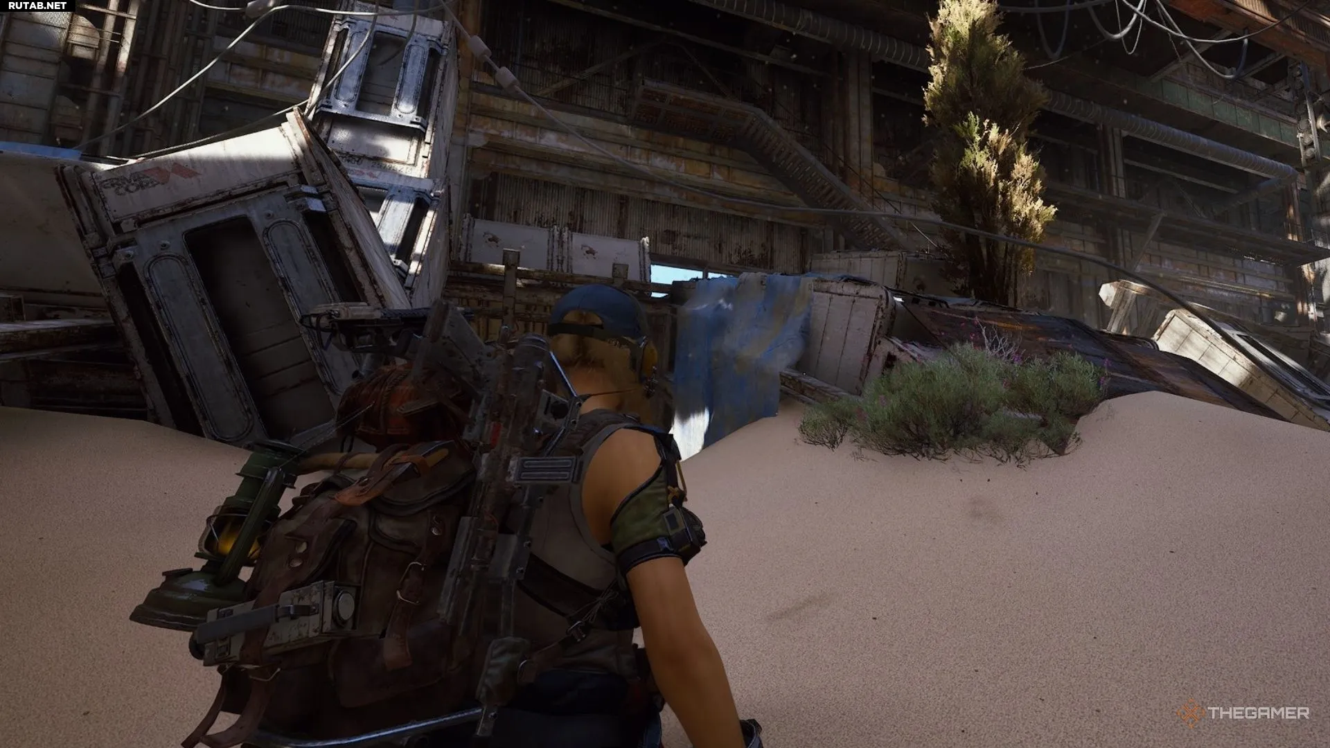 После выполнения всех четырёх передач ваша последняя задача — найти и отметить контейнер, накрытый брезентом. Спуститесь по тому же тросу с последней точки передачи обратно на уровень земли внутри Контейнерного склада.