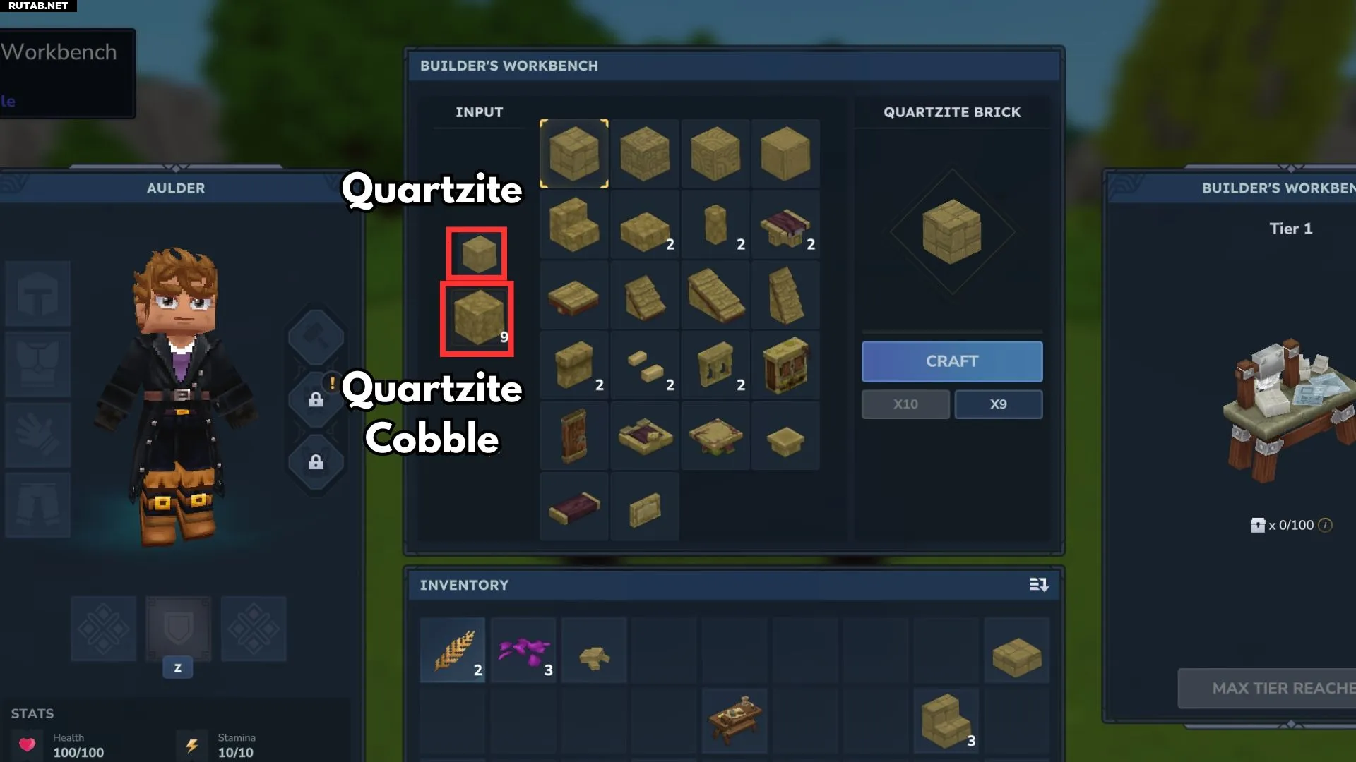Процесс прост: постройте Верстак строителя, поместите Кварцитовый булыжник в секцию «Ввод» и выберите нужный строительный материал из предложенных вариантов. Готовый предмет мгновенно попадёт в ваш инвентарь. Если вы хотите превратить булыжник обратно в чистый кварцит, выберите иконку кварцита в секции «Ввод» (прямо над иконкой булыжника).