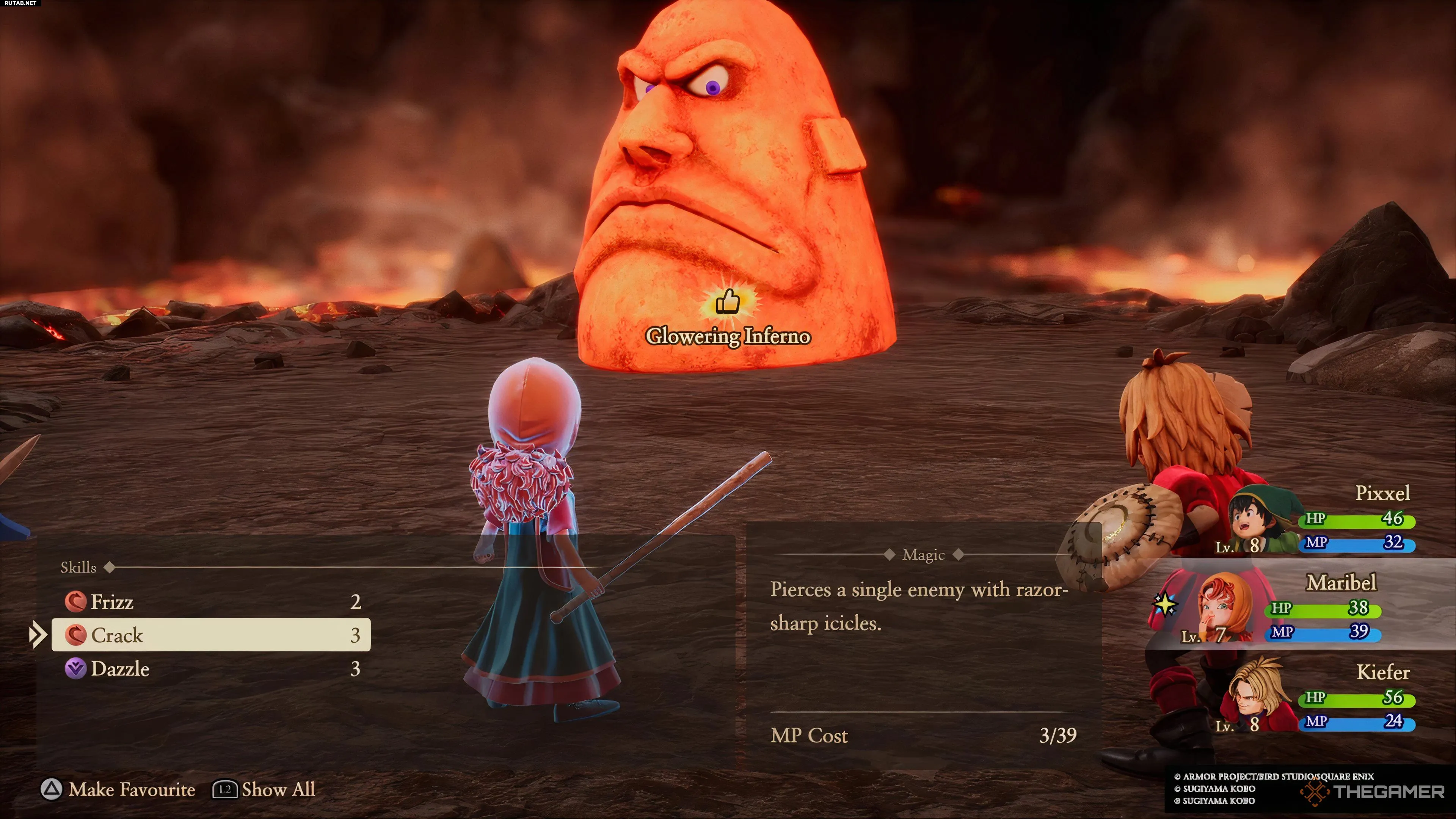При планировании атак учитывайте сопротивляемость Мрачного Пламени. К сожалению, «Фризз» — один из первых заклинаний, доступных Марибель, но, как можно догадаться, оно малоэффективно против босса, обитающего на дне вулкана.