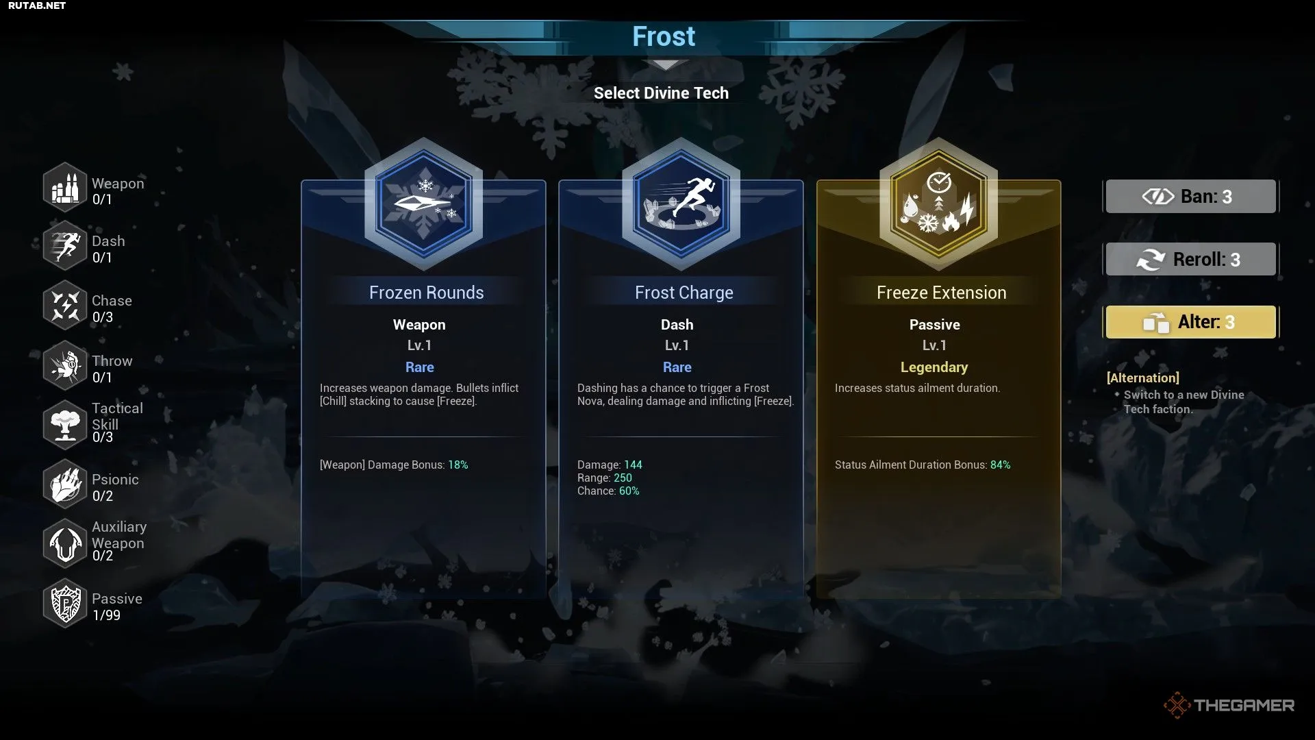 Короче говоря, каждая Божественная технология принадлежит к фракции (группе), которую можно увидеть в верхней части экрана. Каждая фракция содержит фиксированное количество технологий, и вы всегда будете выбирать из одного и того же пула опций. Например, фракция «Мороз» включает такие технологии, как «Ледяные патроны» и «Ледяной рывок».