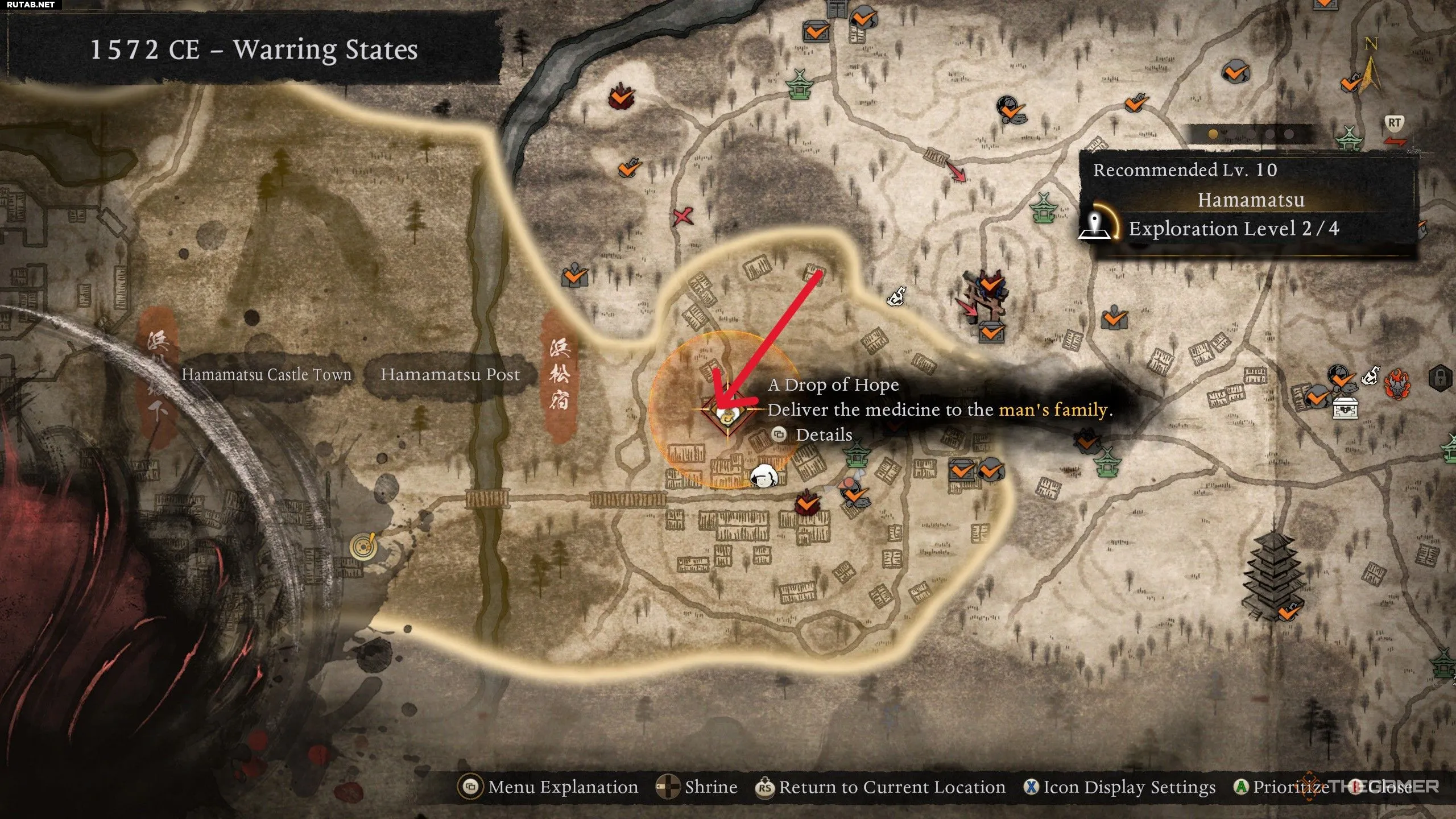 После победы зайдите в дом, который он охранял, и взаимодействуйте с телом. Это «доставит» лекарство, принесет вам награды и завершит квест «Капля надежды». Рекомендуется выполнить его перед штурмом замка Хамамацу, чтобы достичь хотя бы 12-13 уровня и не быть разгромленным более сильными ёкаями в округе.