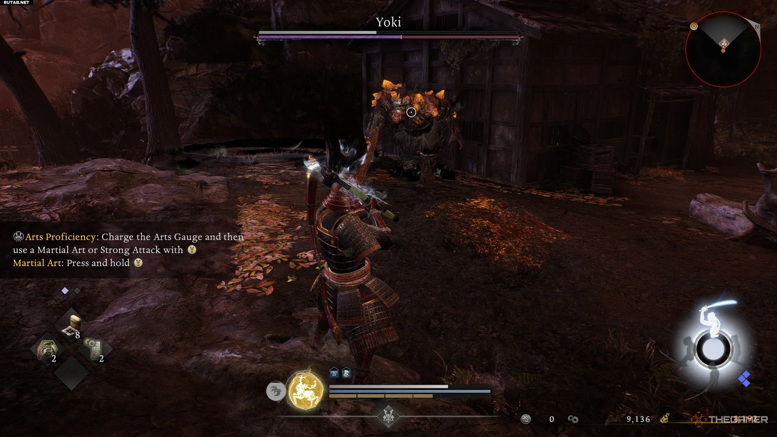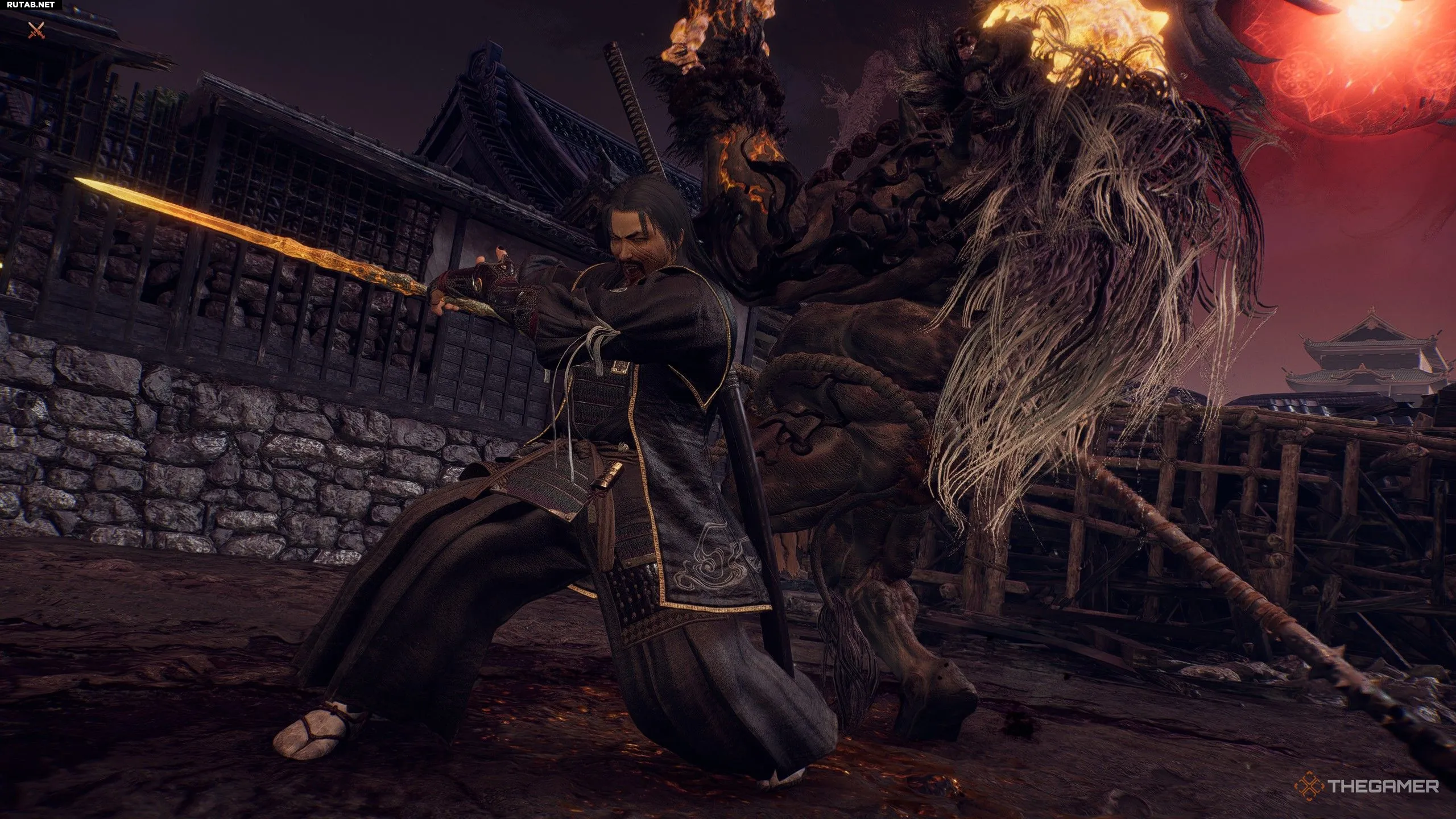 Его атаки довольно просты: это в основном рубящие удары перед собой и прорывную атаку (Burst Attack), которую можно парировать. Поскольку это мини-босс, вы можете легко подавить его и оглушать сериями ударов. Его шкала ки будет быстро истощаться, если вы продолжите давить на него между его атаками — особенно в форме самурая.