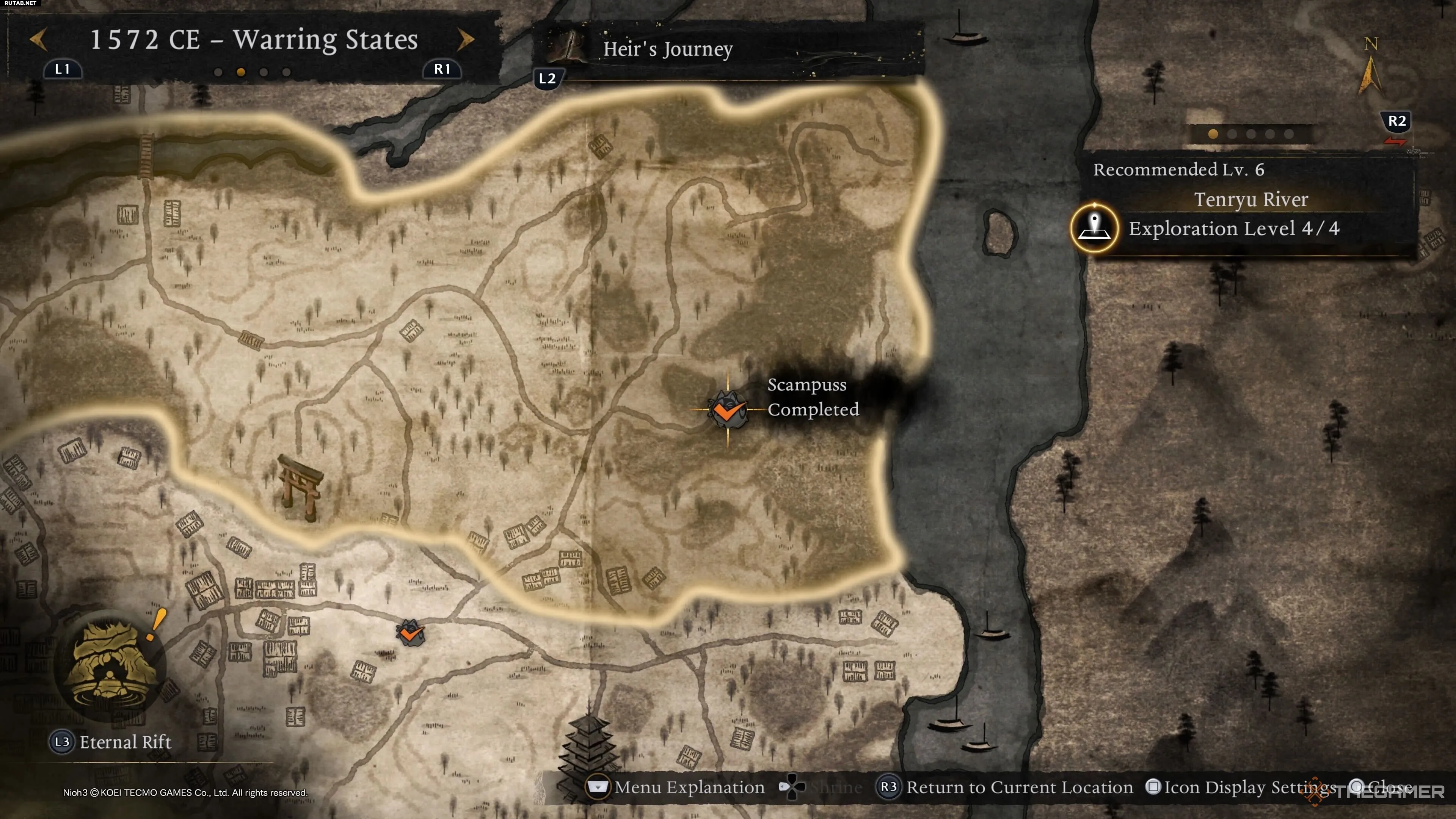 На Реке Тэнрю можно найти только одного Скампуса, и до него можно добраться от Святилища Холма Перспективы. Отсюда направляйтесь налево и вниз, чтобы найти полосатого Скампуса, который побежит вокруг вас кругами, а затем пролезет в щель на север. Достигнув берега, он запрыгнет на скалы и поднимется на вершину утёса, где его можно будет забрать.