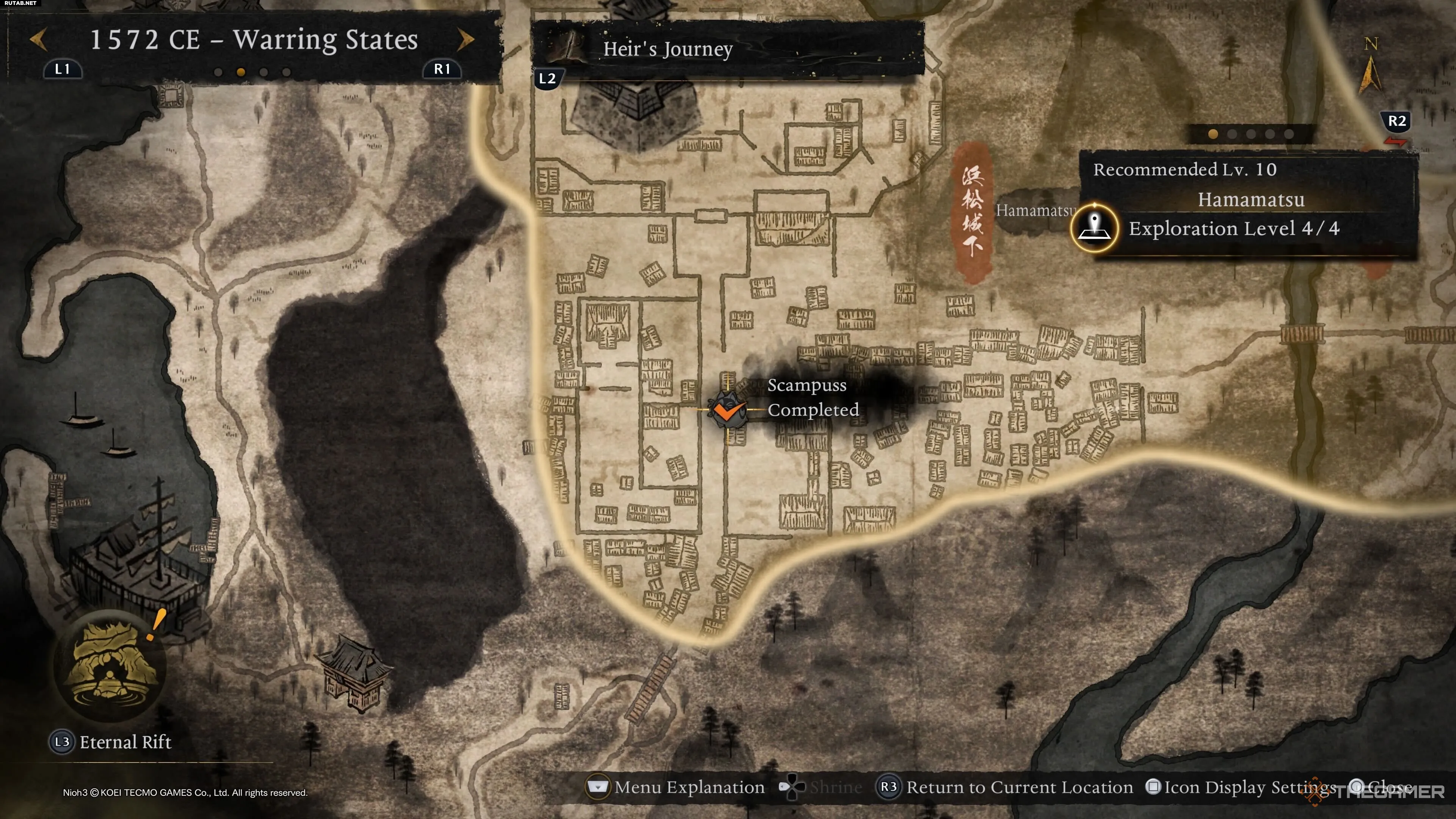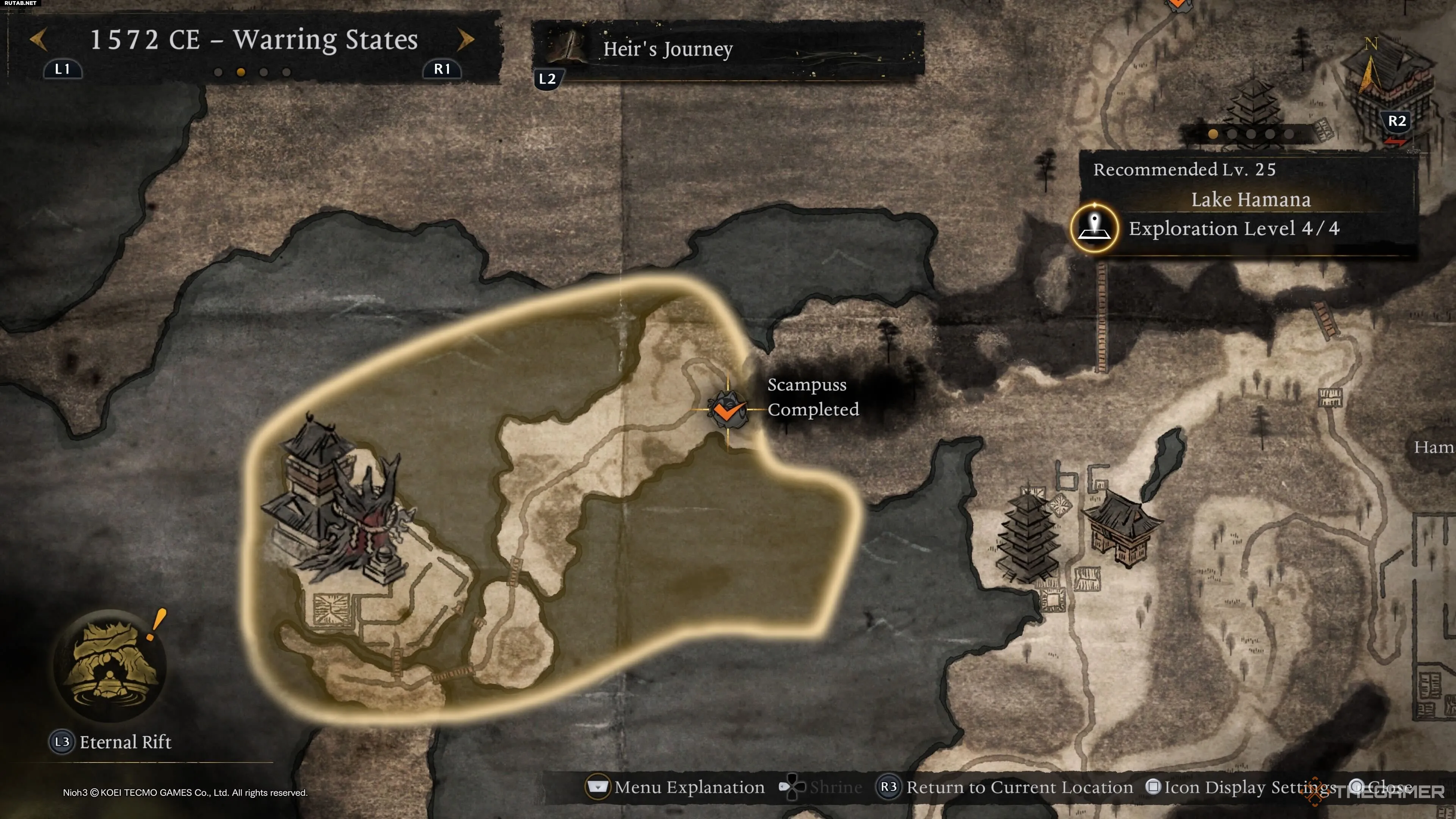 Скампус Озера Хамана находится в самом начале локации, сразу за Святилищем Моста Отсури. Вам лучше подождать, пока вы завершите эту зону, потому что вначале там находится очень злой Ёкай, который будет швыряться в вас молниями.